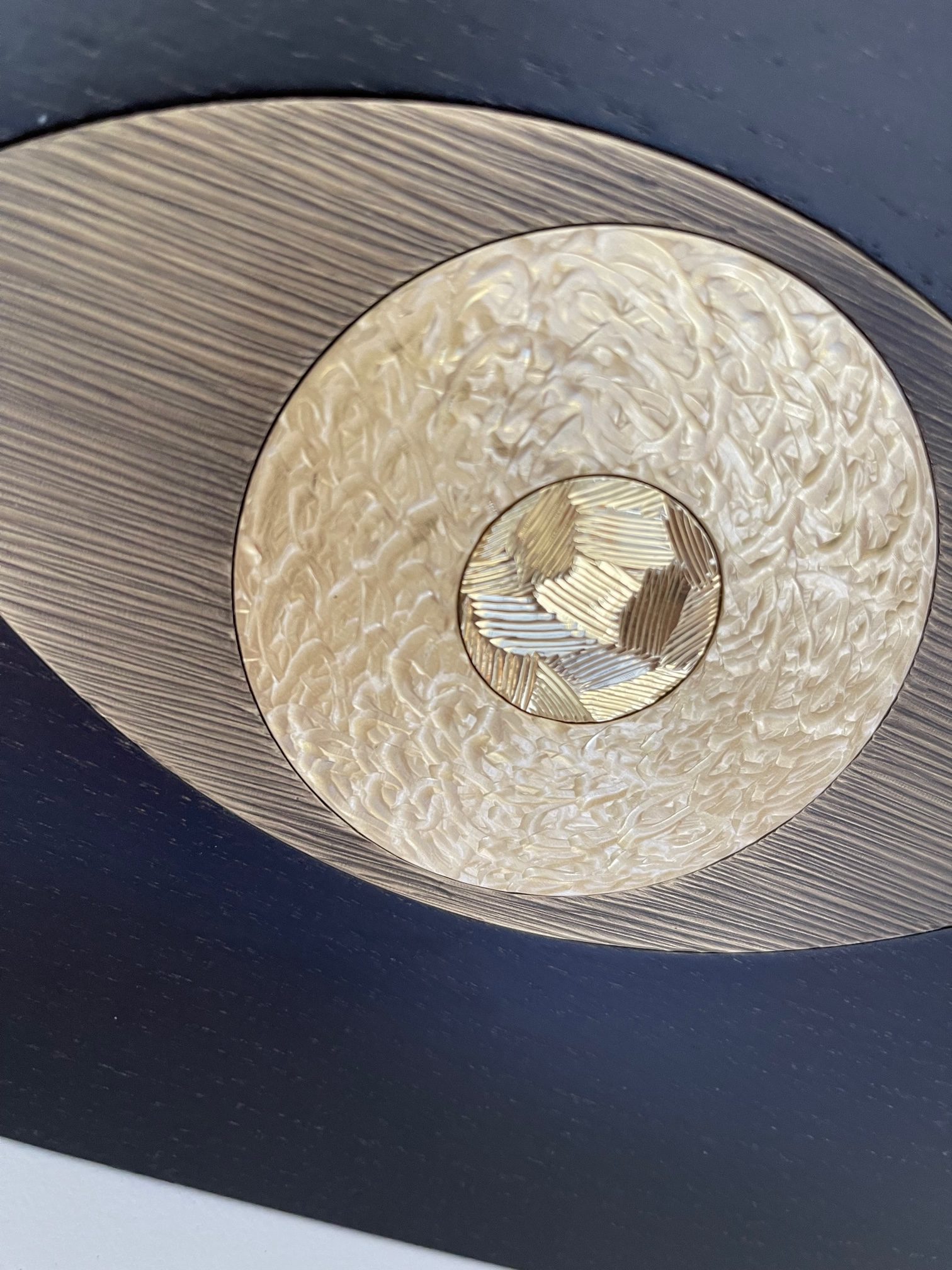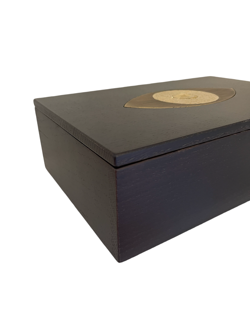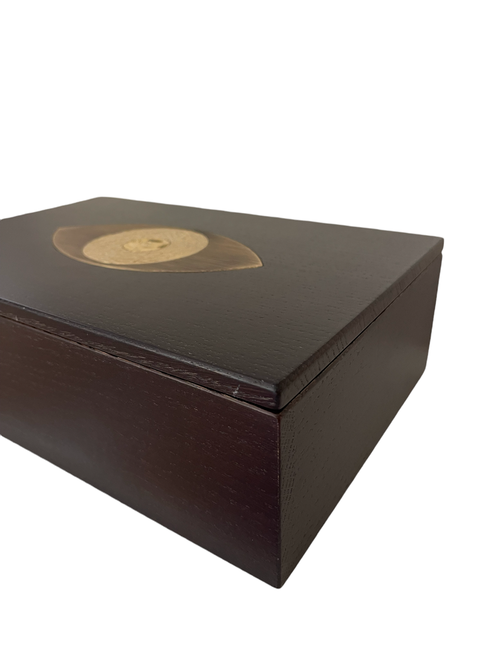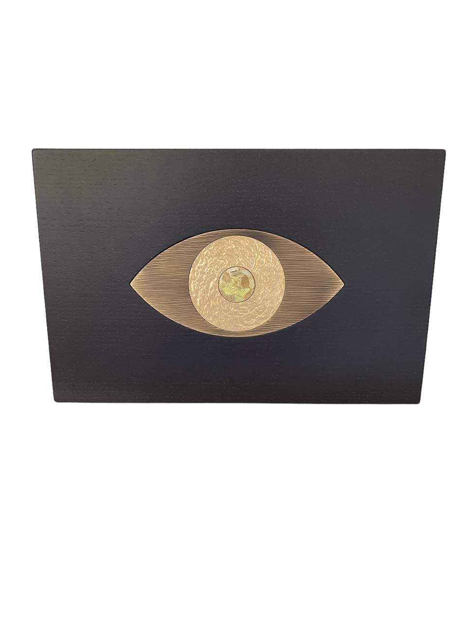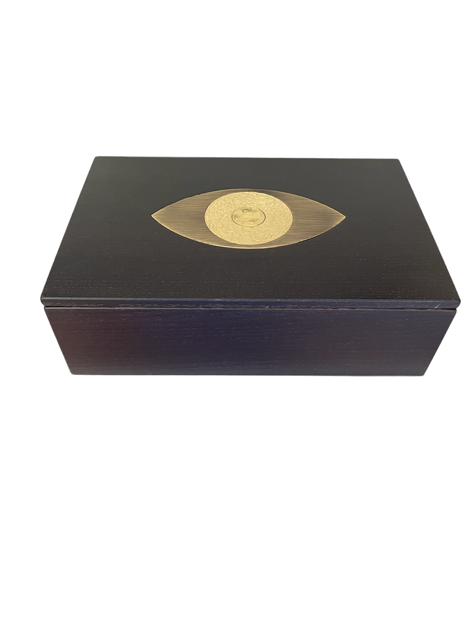 Cette boite est composée de deux parties en chêne massif teinté wengé avec en son centre un Oeil en laiton massif gravé de trois différents motifs, dans les tons de bronze et dorés :