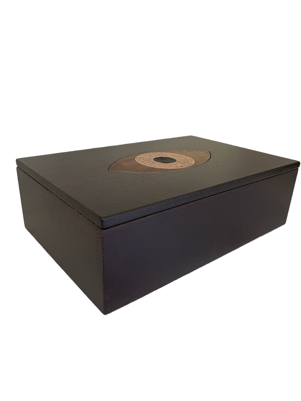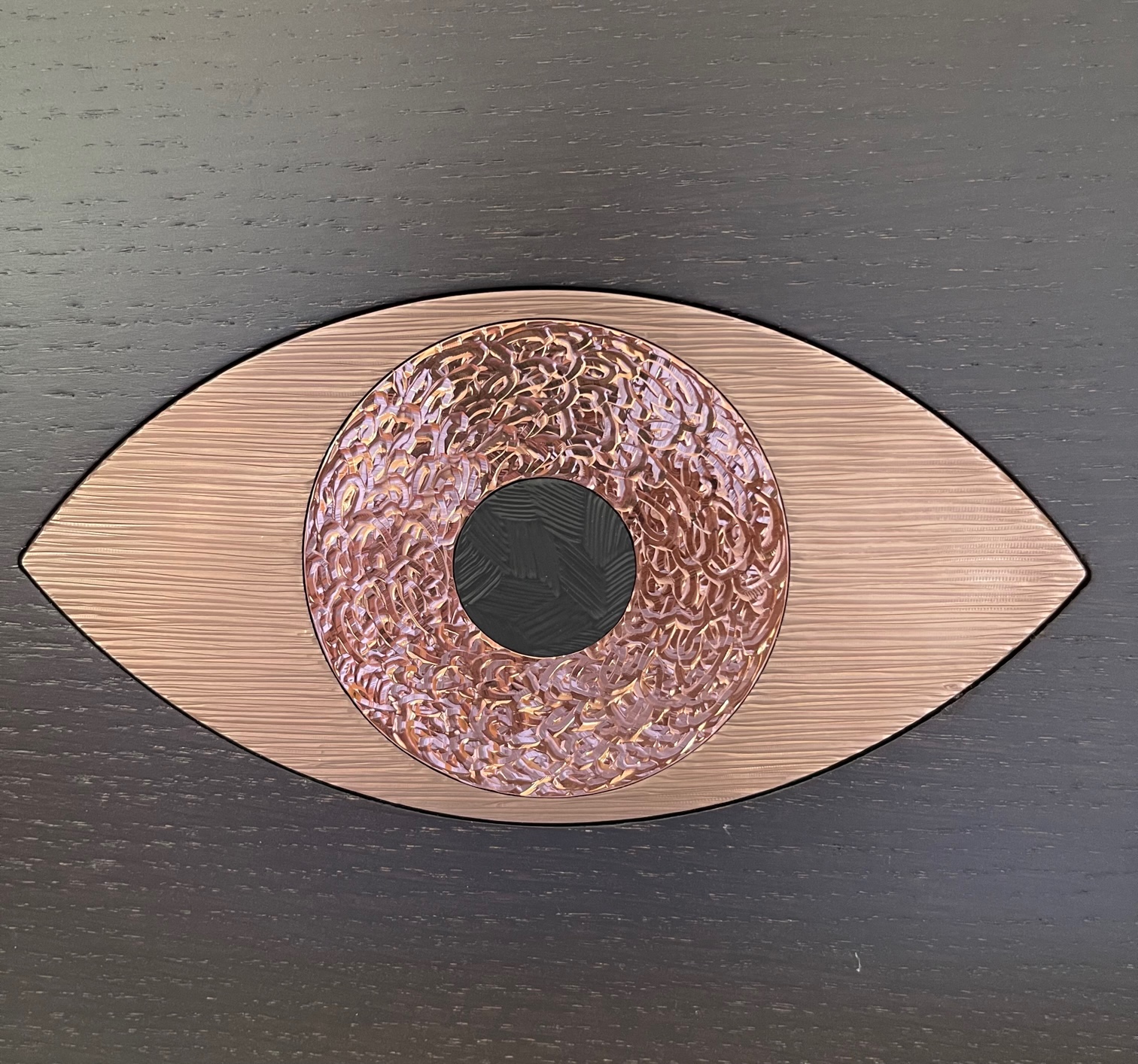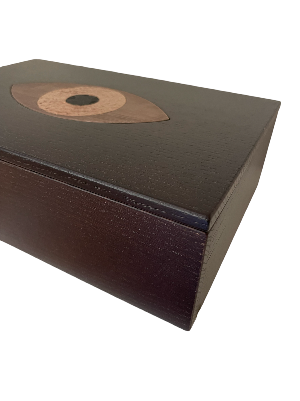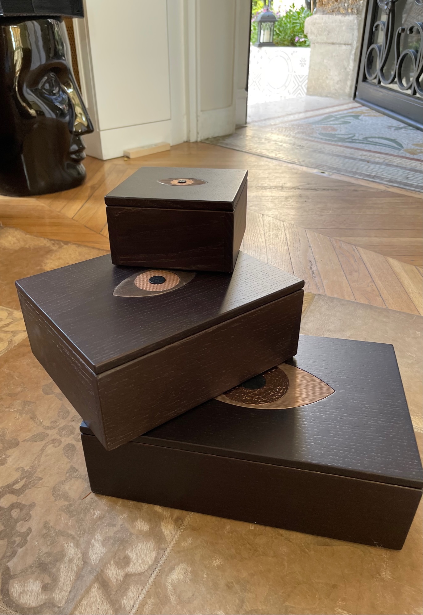 Cette boite est composée de deux parties en chêne massif teinté wengé avec en son centre un Oeil en laiton  massif gravé de trois différents motifs, dans les tons de cuivrés :