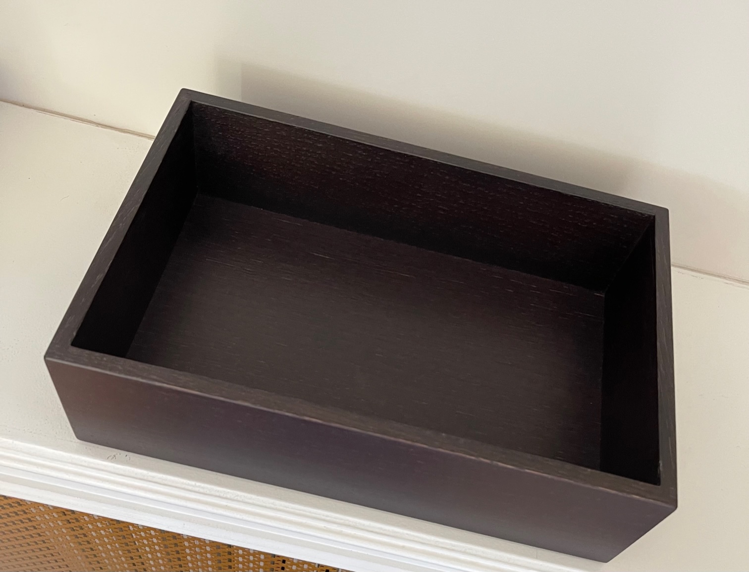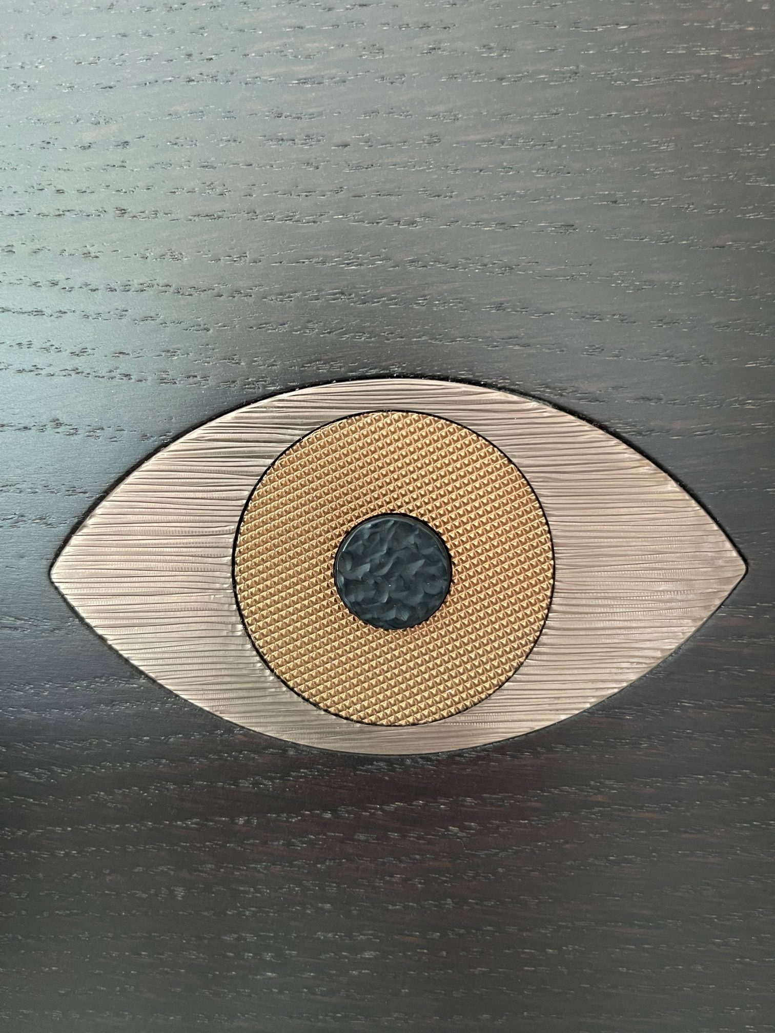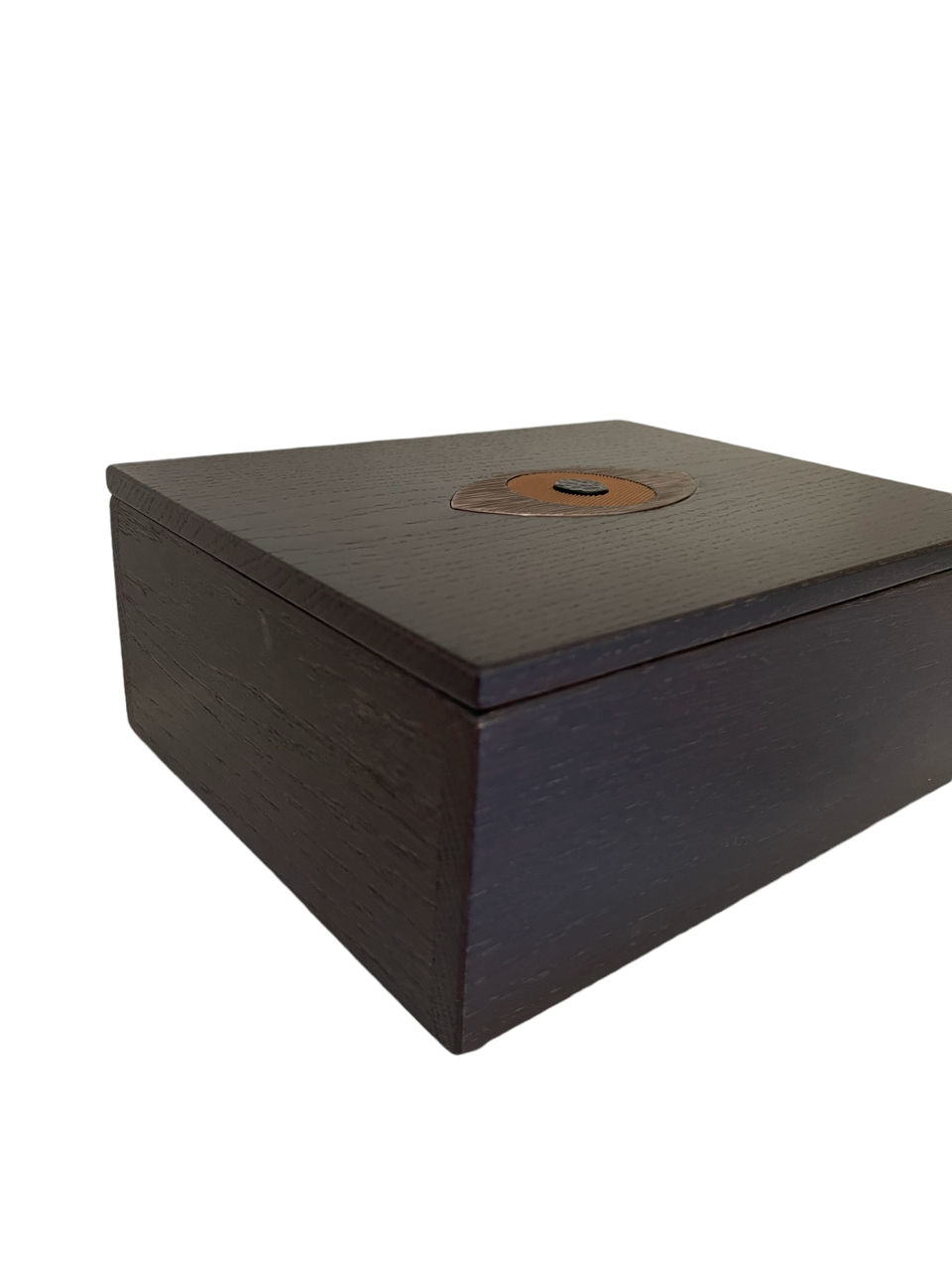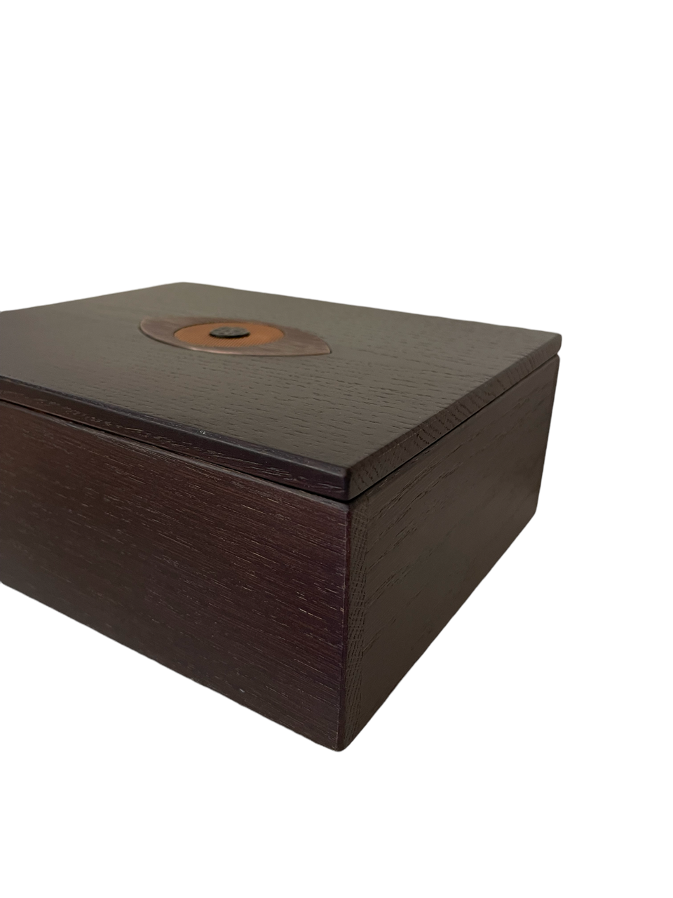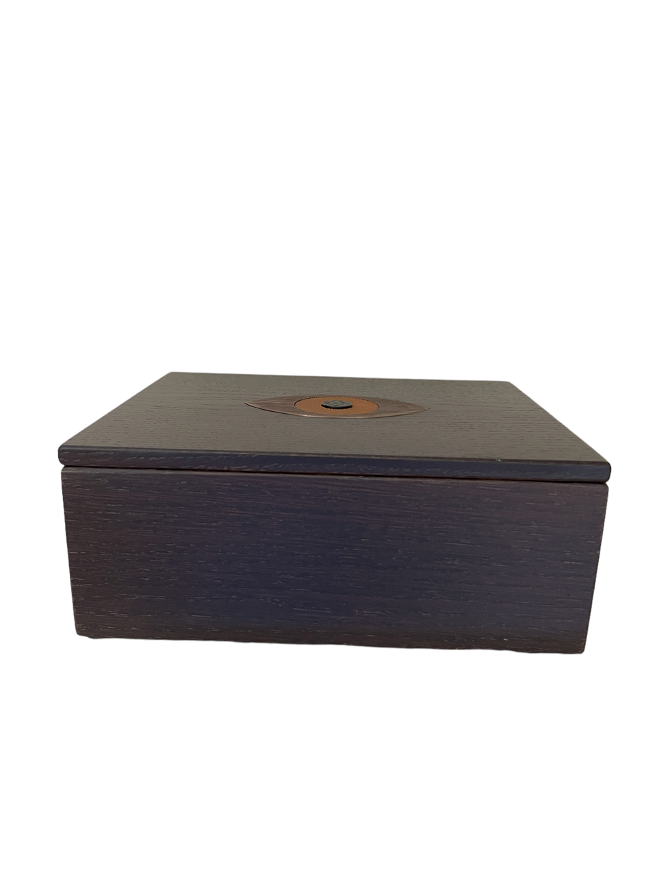 Cette boite est composée de deux parties en chêne massif teinté wengé avec en son centre un Oeil en laiton massif gravé de trois différents motifs, dans les tons de cuivrés :