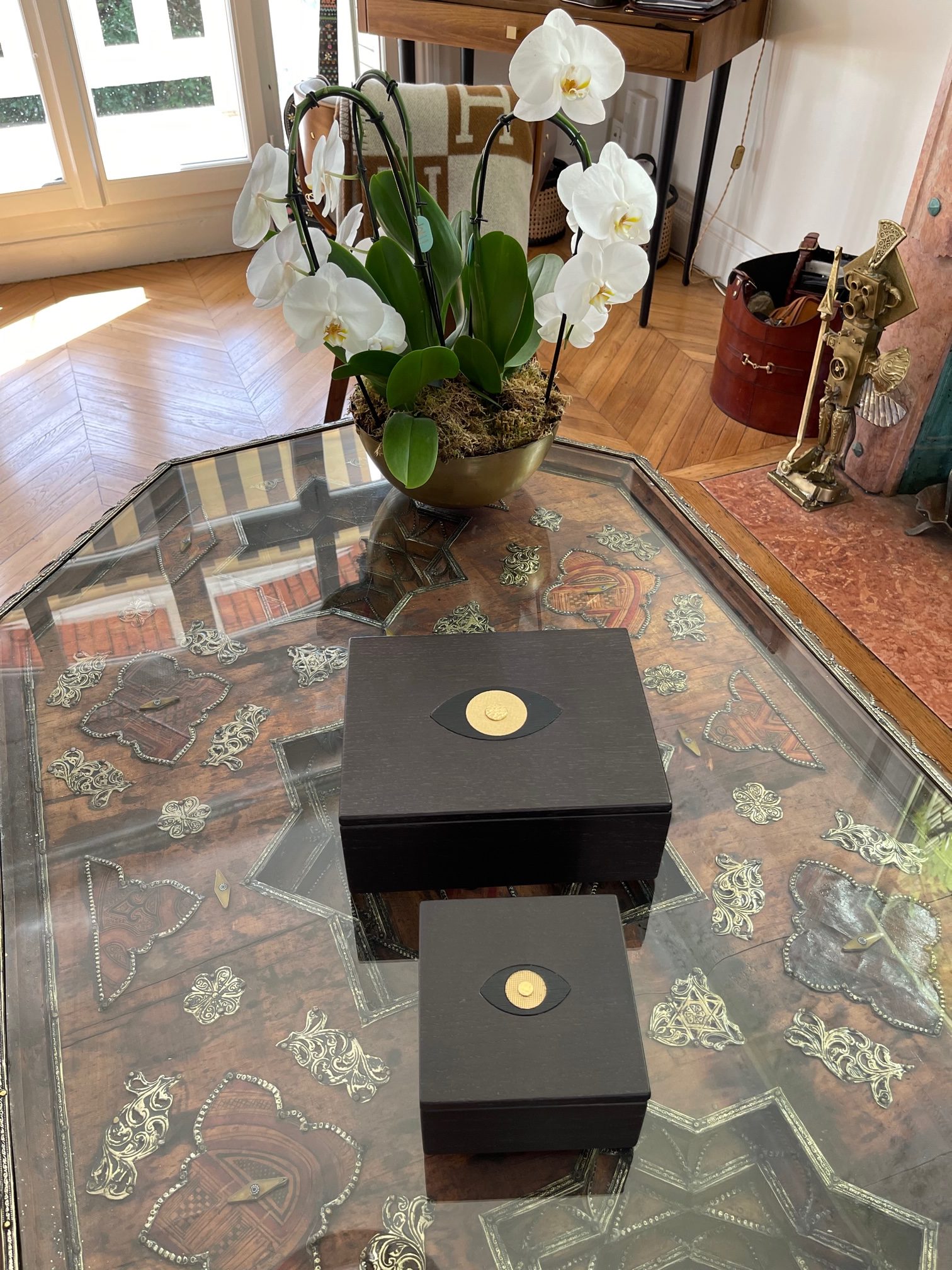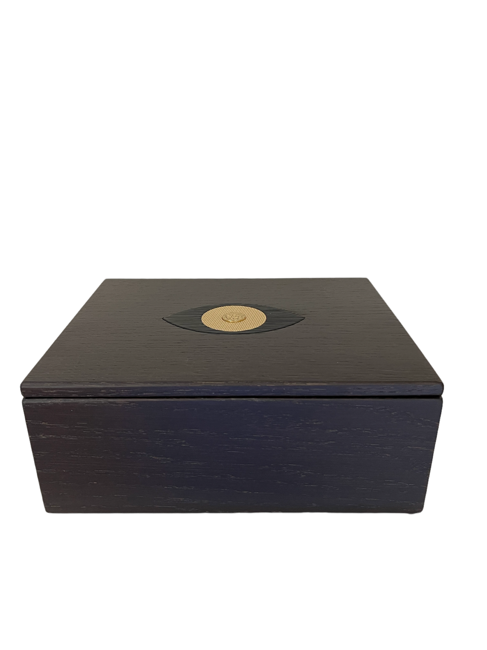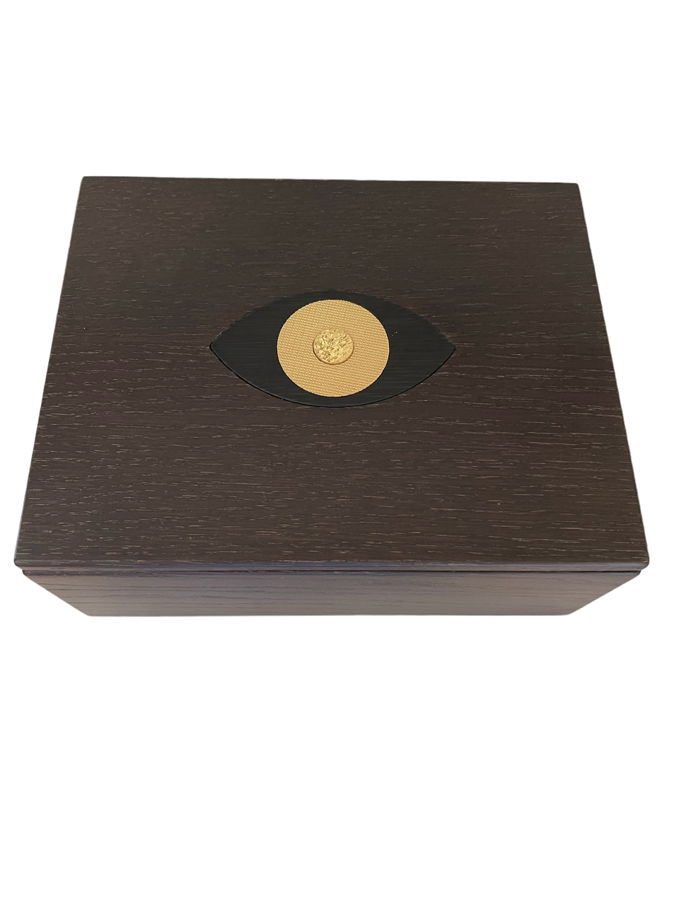 Cette boite est composée de deux parties en chêne massif teinté wengé avec en son centre un Oeil en laiton massif gravé de trois différents motifs dans les tons noir & or