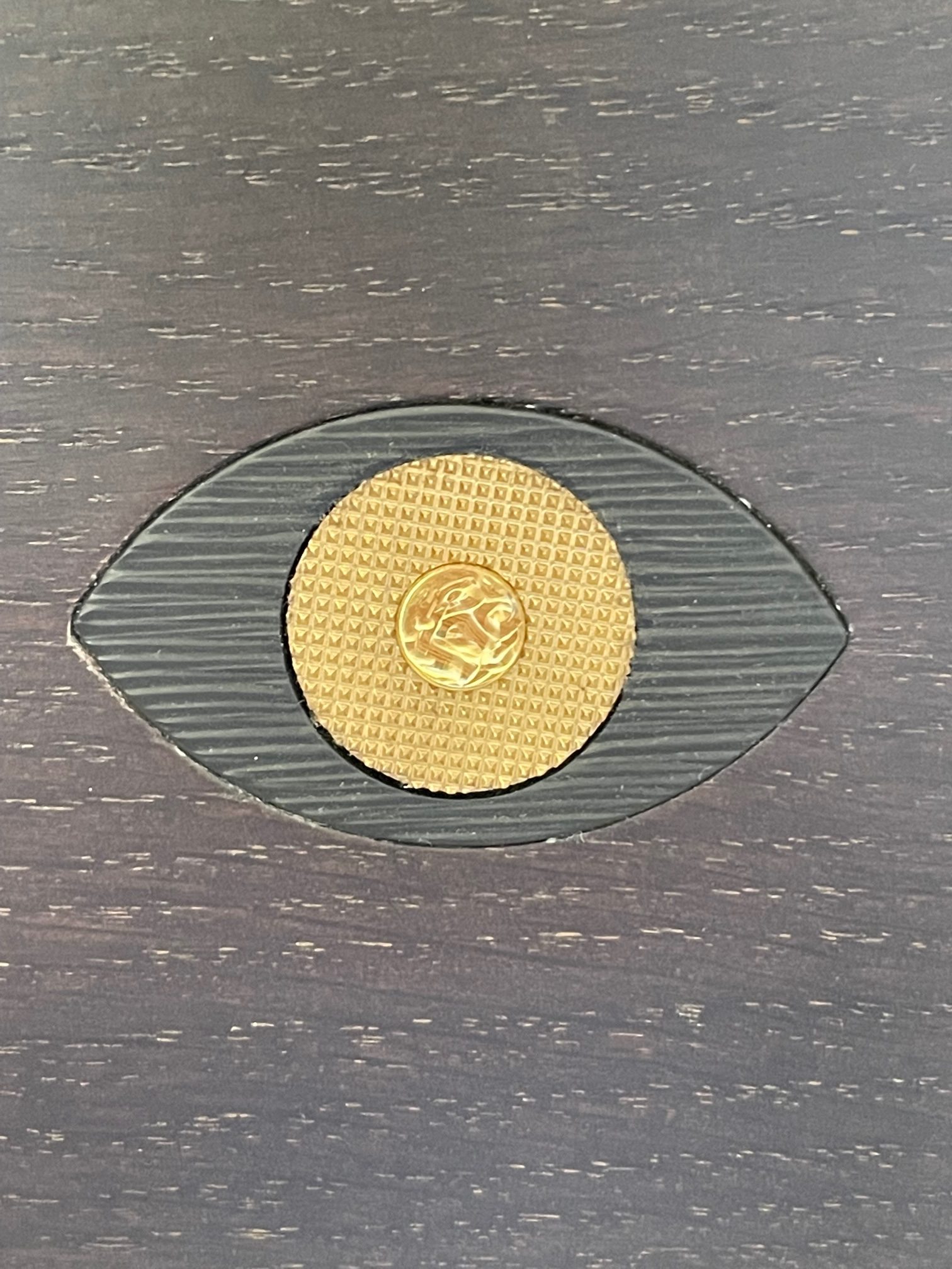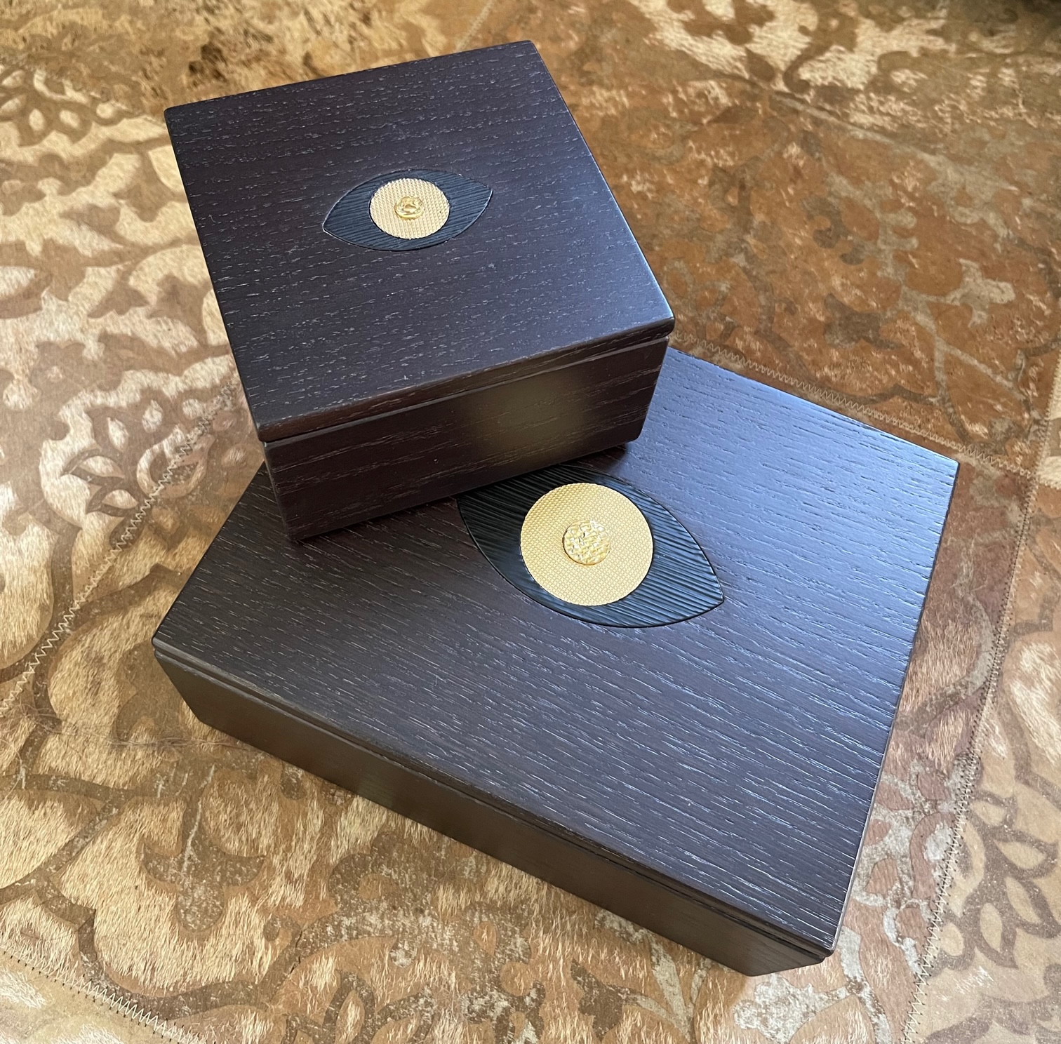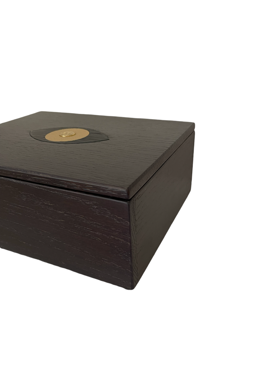 Cette boite est composée de deux parties en chêne massif teinté wengé avec en son centre un Oeil en laiton massif gravé de trois différents motifs dans les tons noir & or