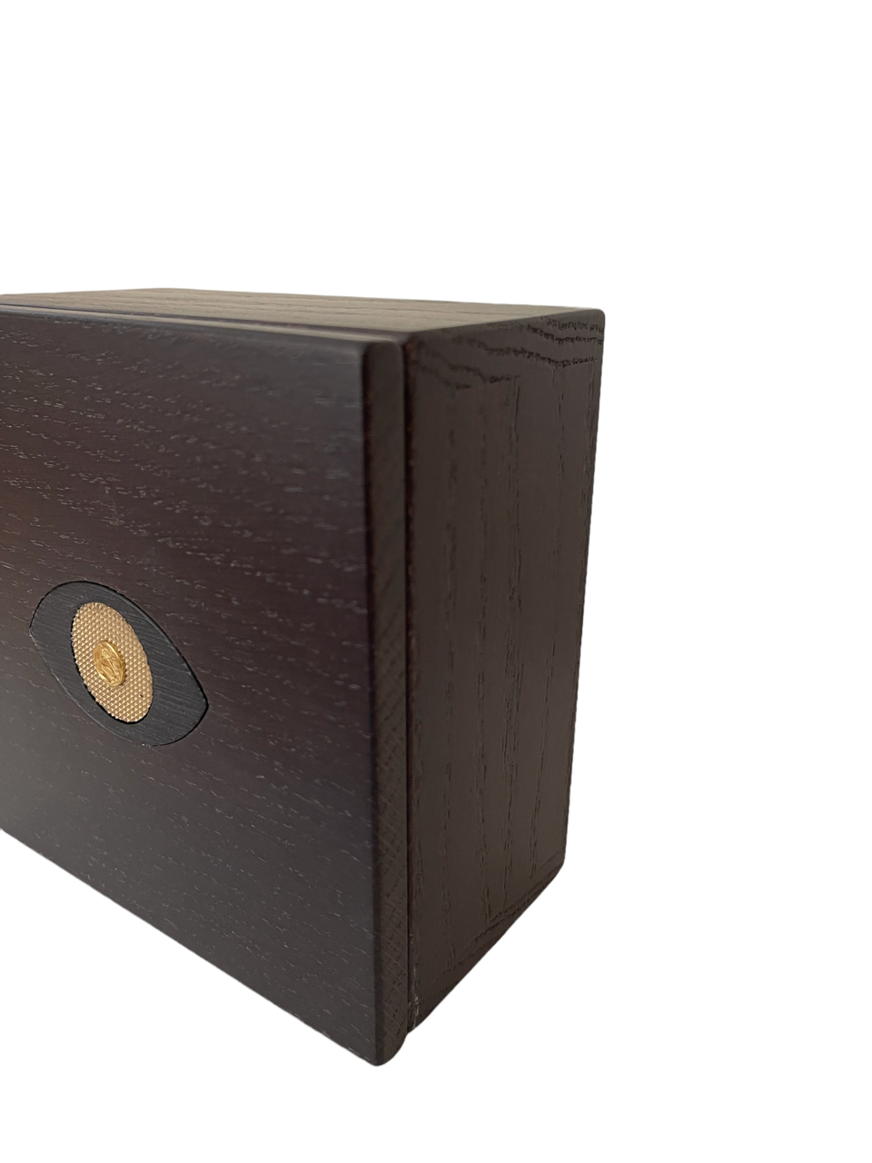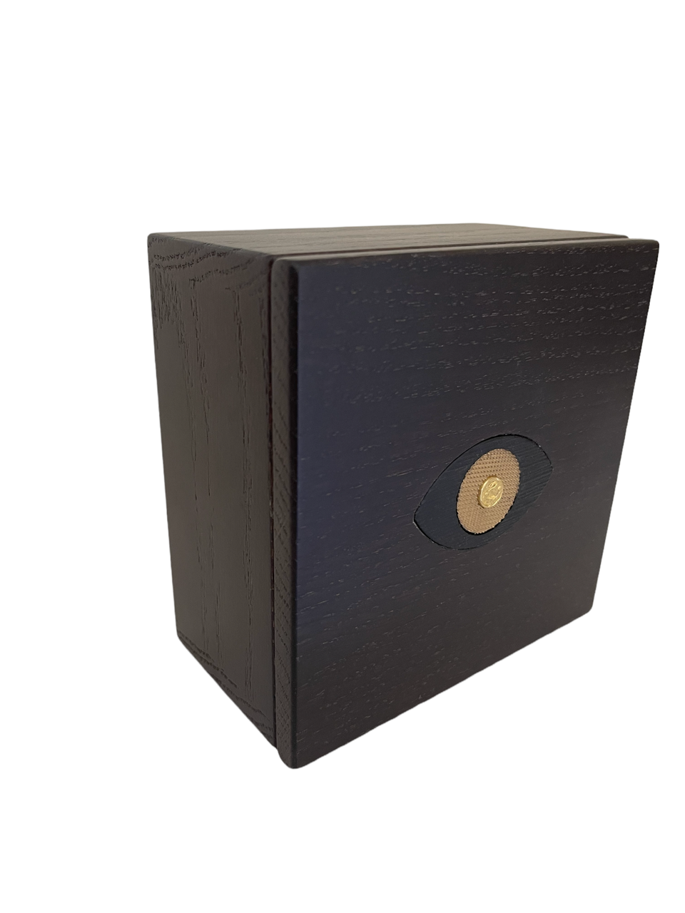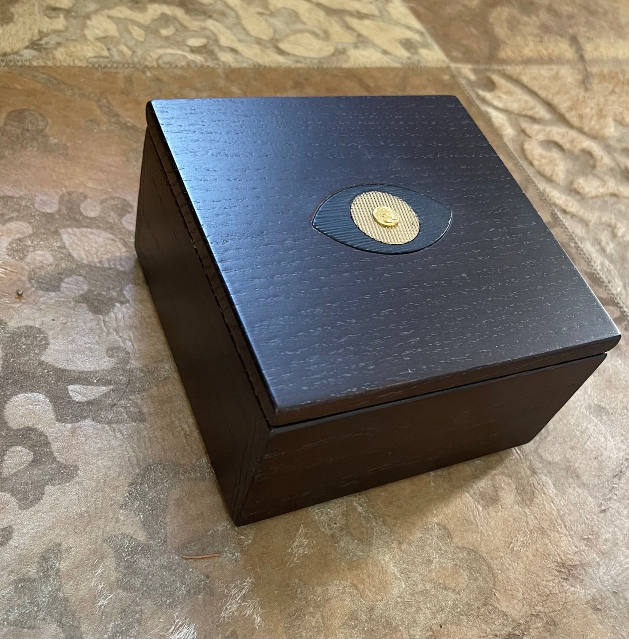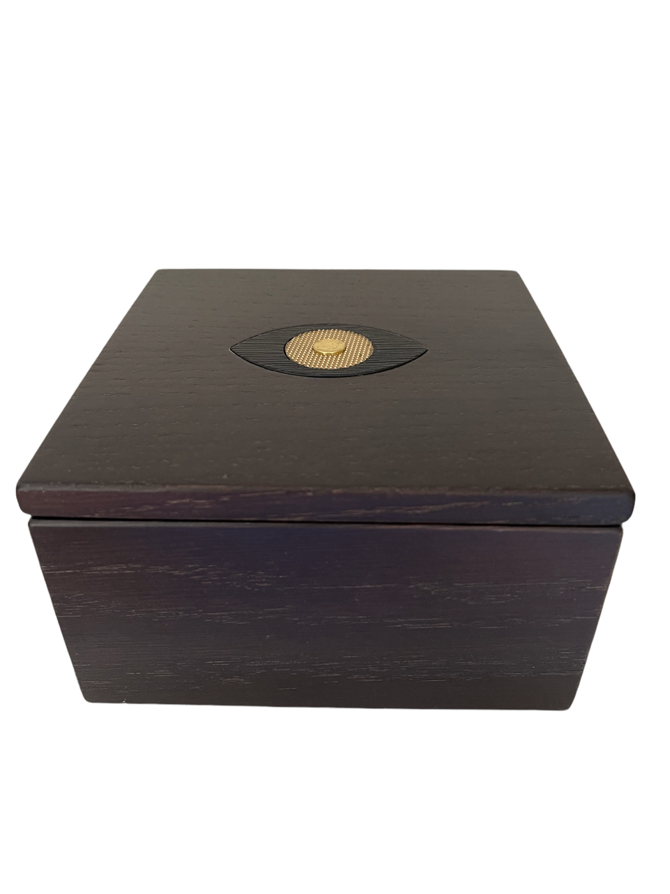 Cette boite est composée de deux parties en chêne massif teinté wengé avec en son centre un Oeil en laiton  massif gravé de trois différents motifs dans les tons noir & or