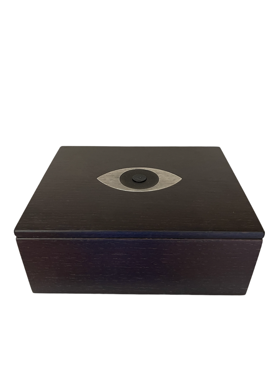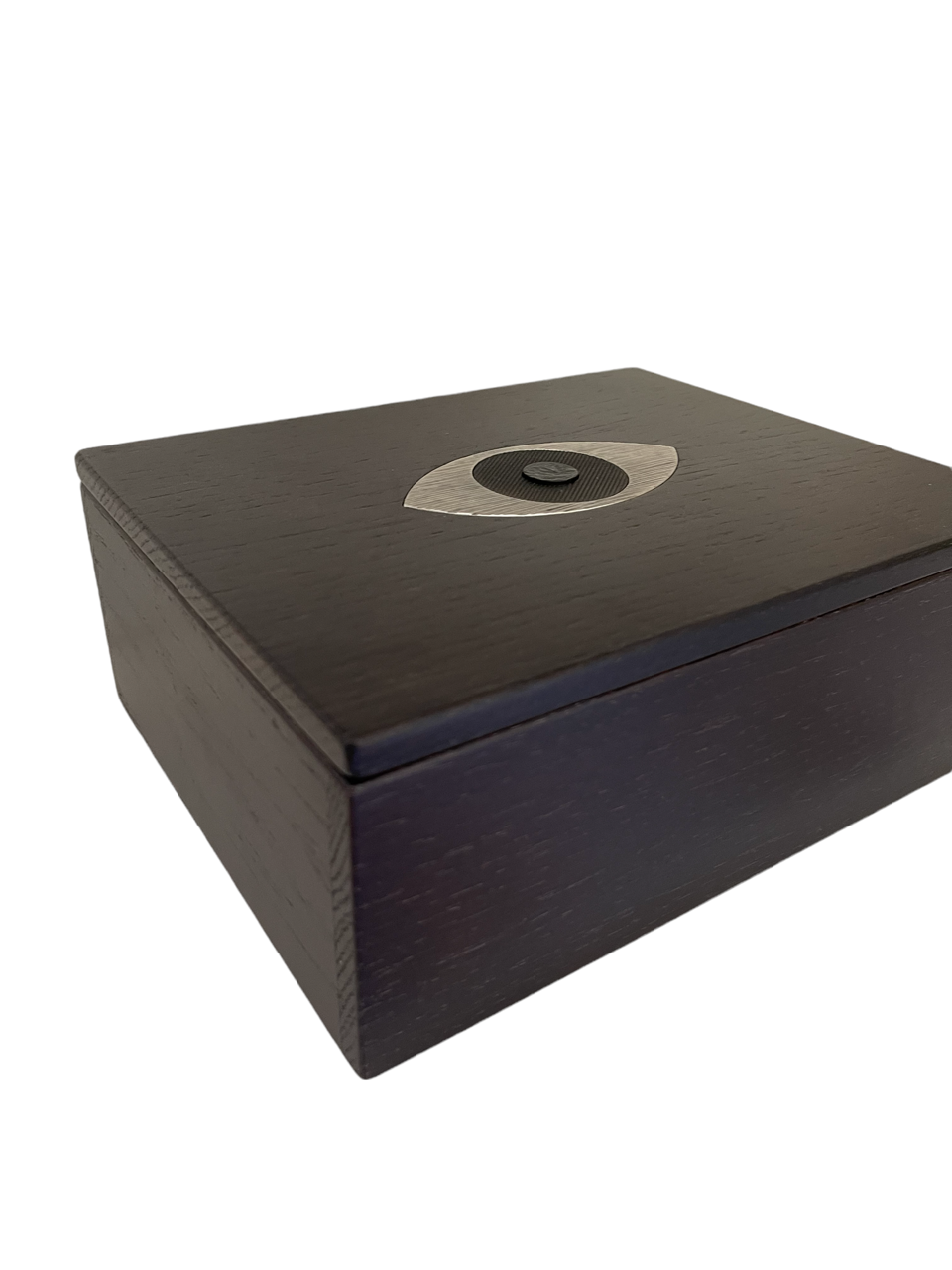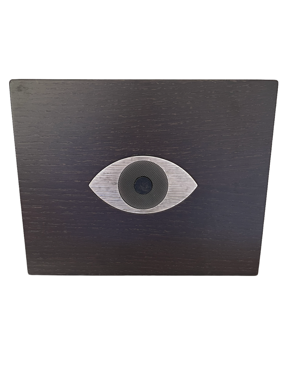 Cette boite est composée de deux parties en chêne massif teinté wengé avec en son centre un Oeil en laiton massif gravé de trois différents motifs dans les tons froids old silver :
