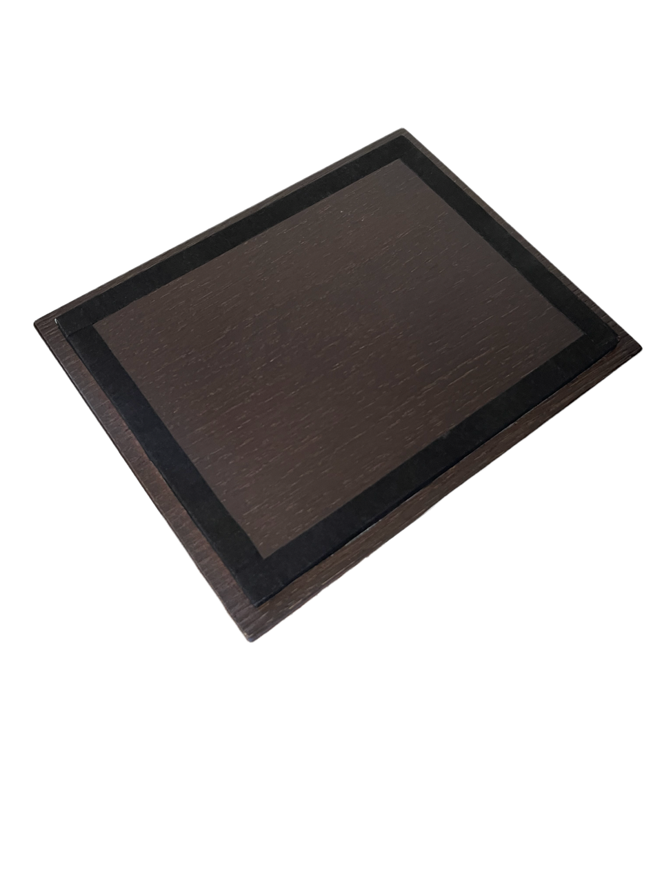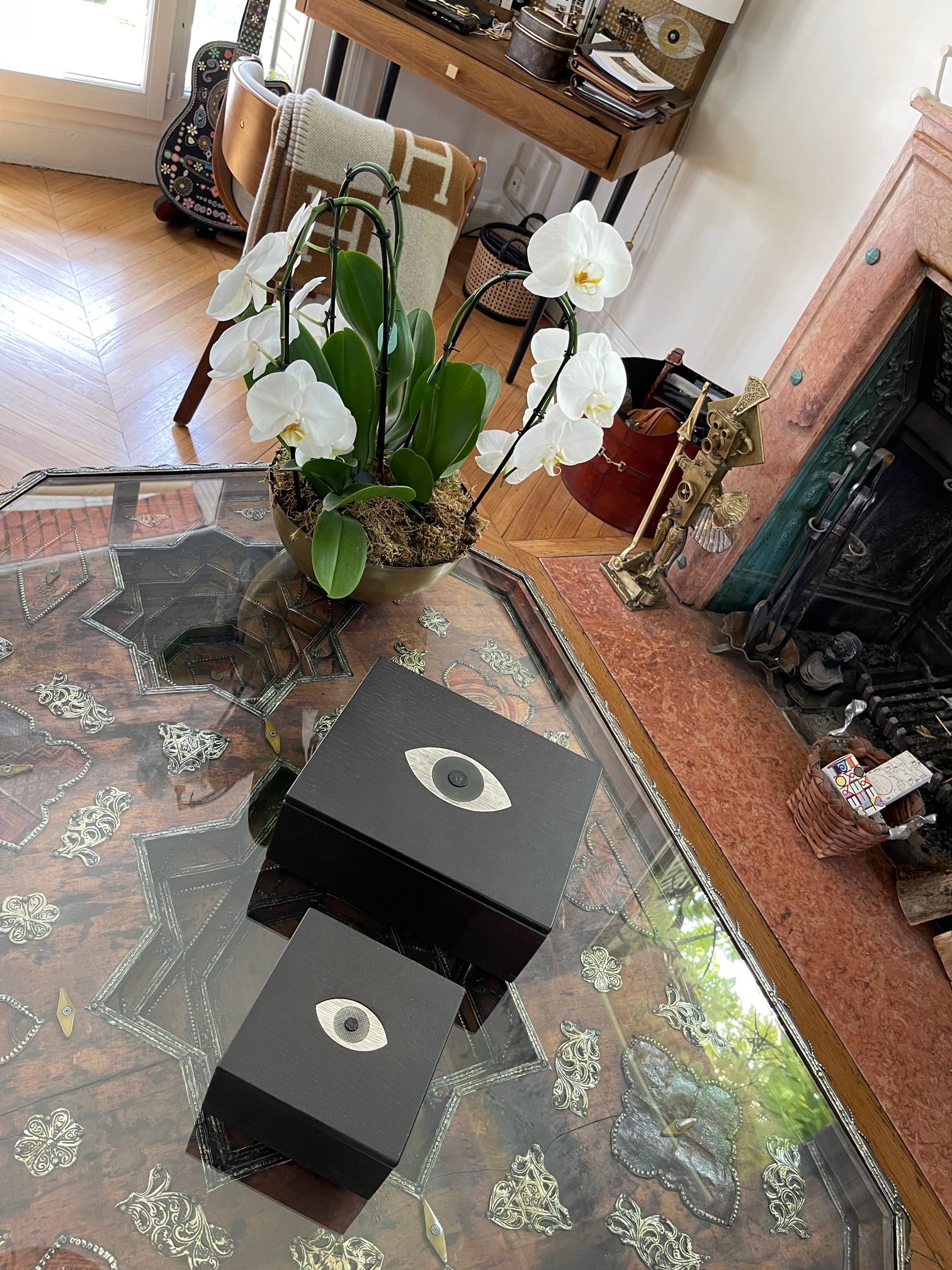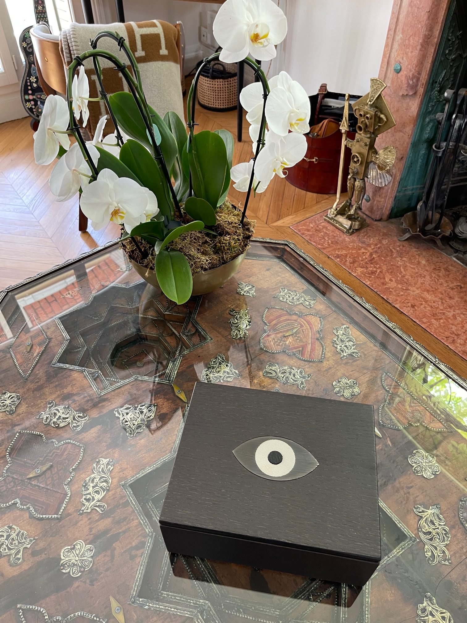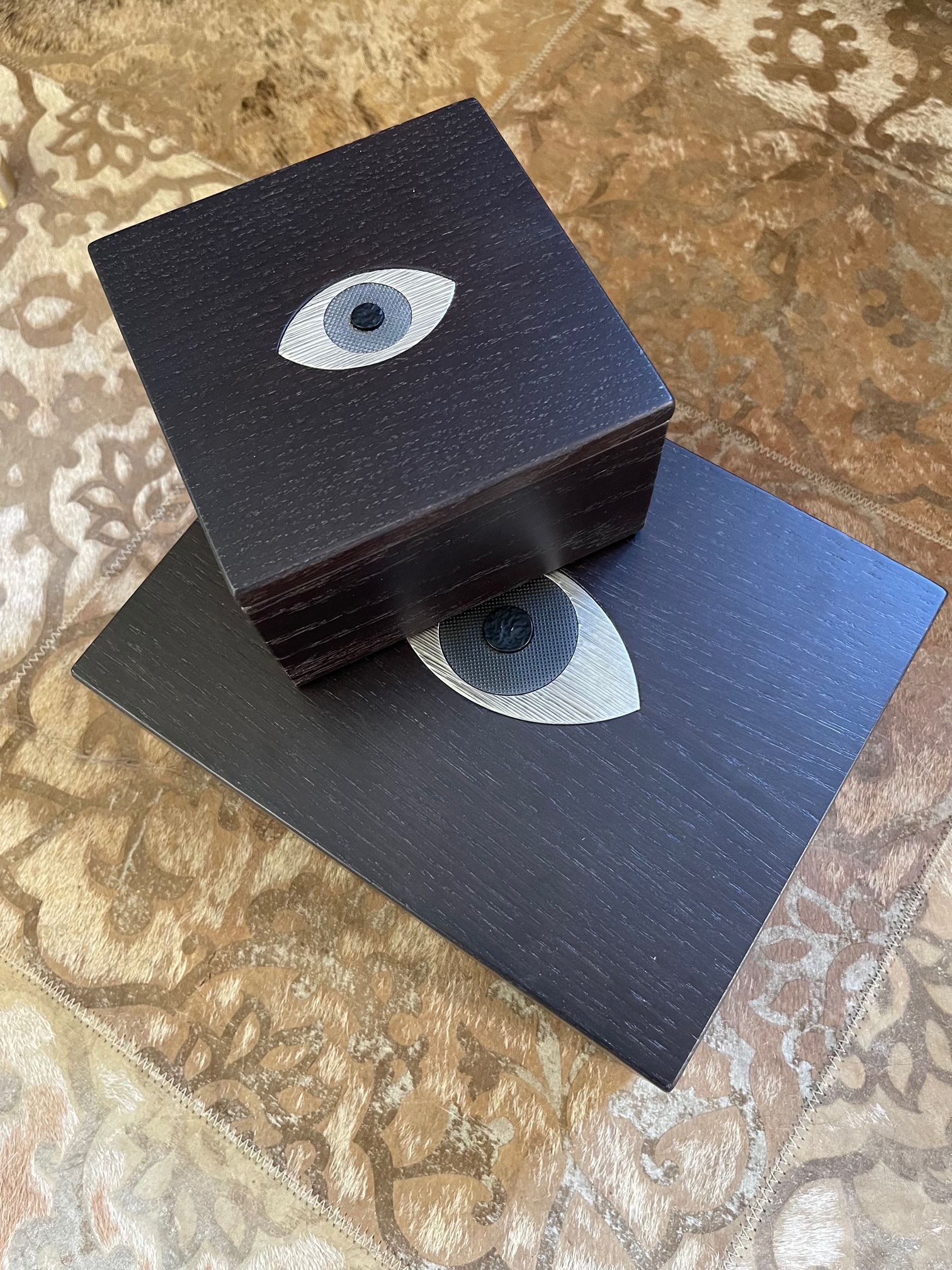 Cette boite est composée de deux parties en chêne massif teinté wengé avec en son centre un Oeil en laiton massif gravé de trois différents motifs dans les tons froids old silver :
