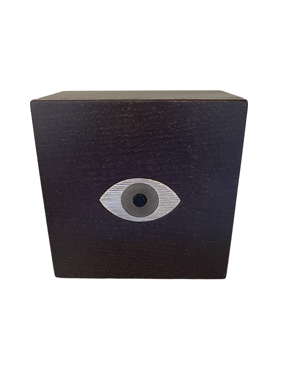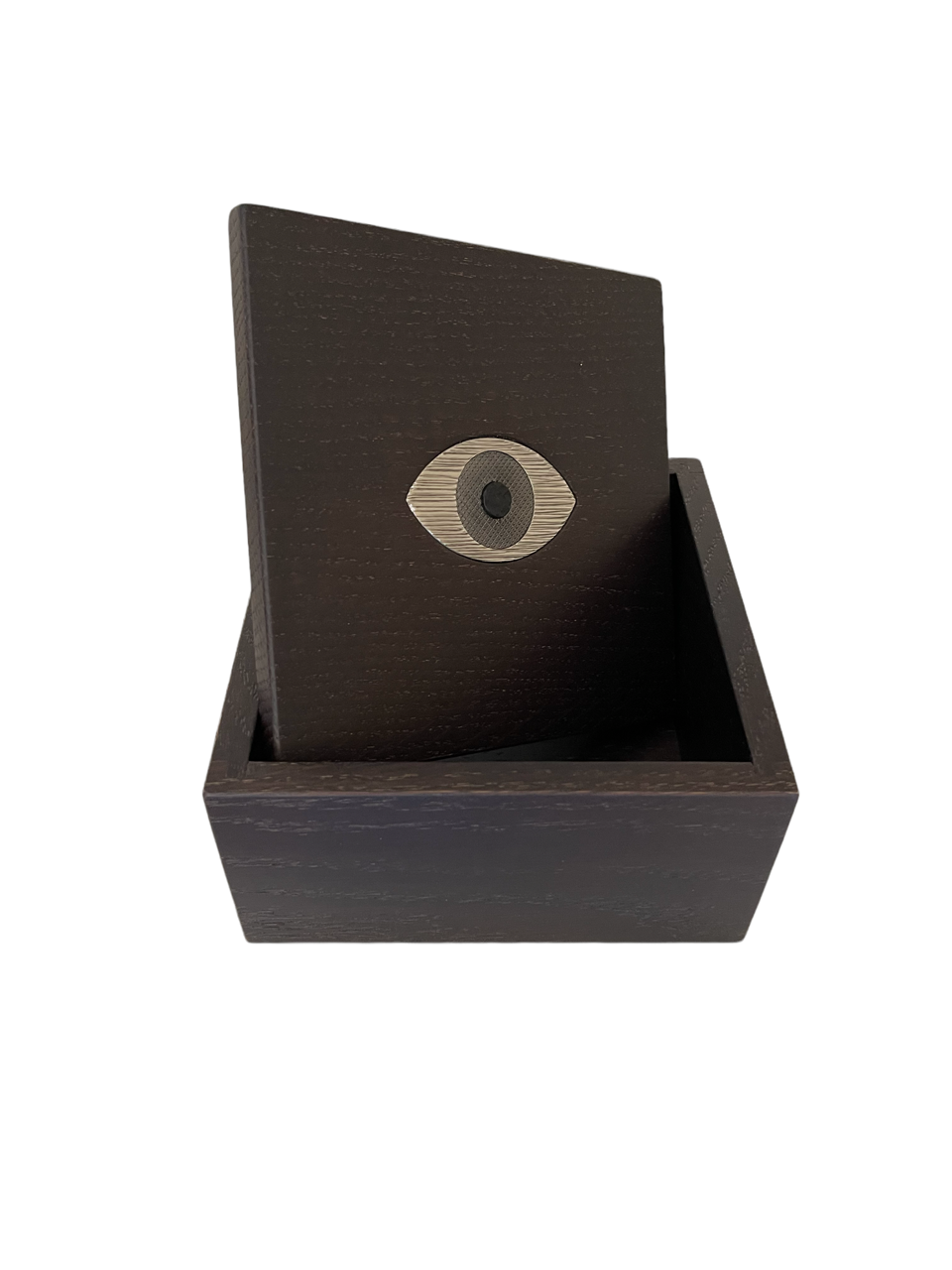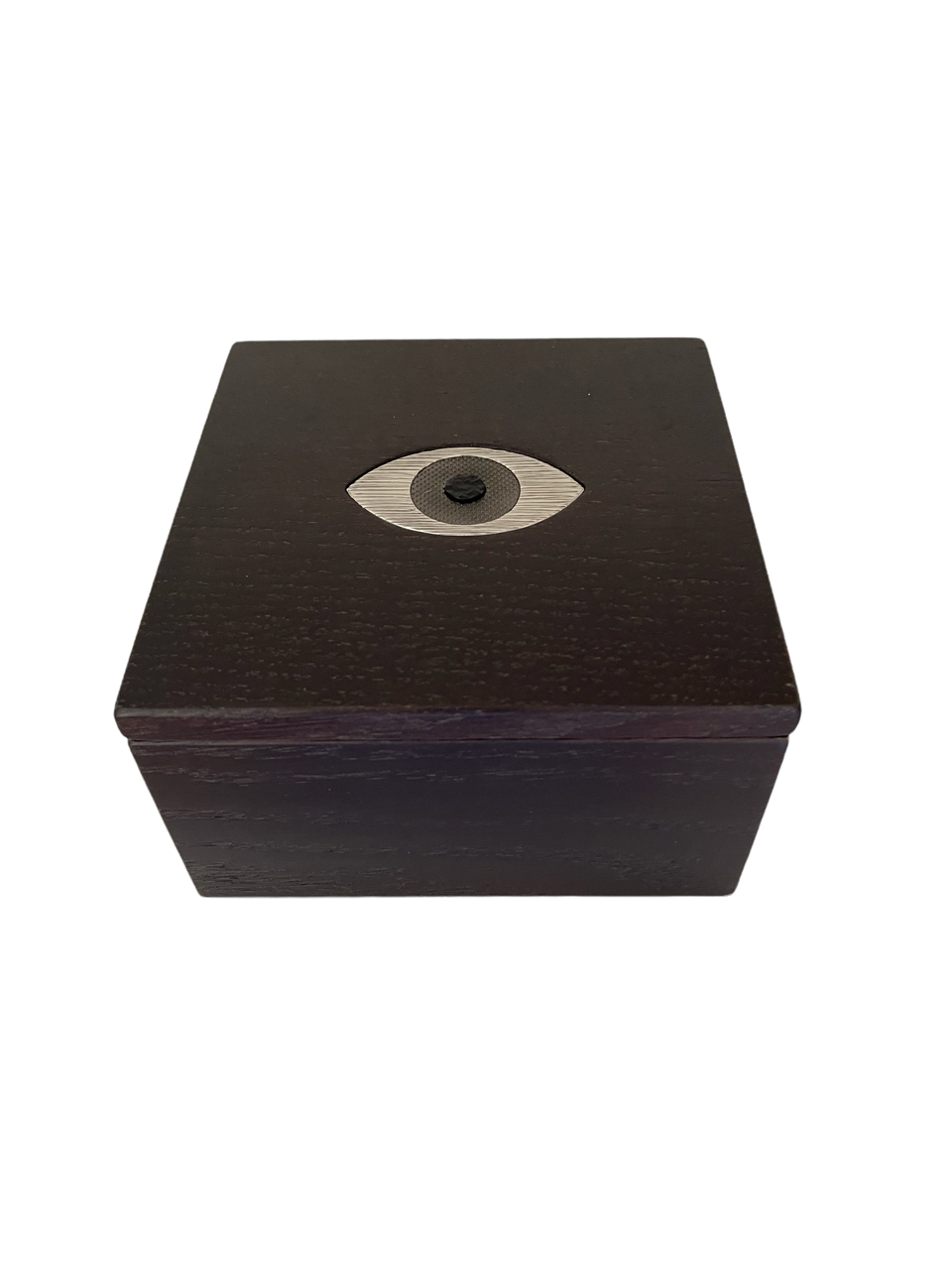 Cette boite est composée de deux parties en chêne massif teinté wengé avec en son centre un Oeil en laiton massif gravé de trois différents motifs dans les tons froids old silver :