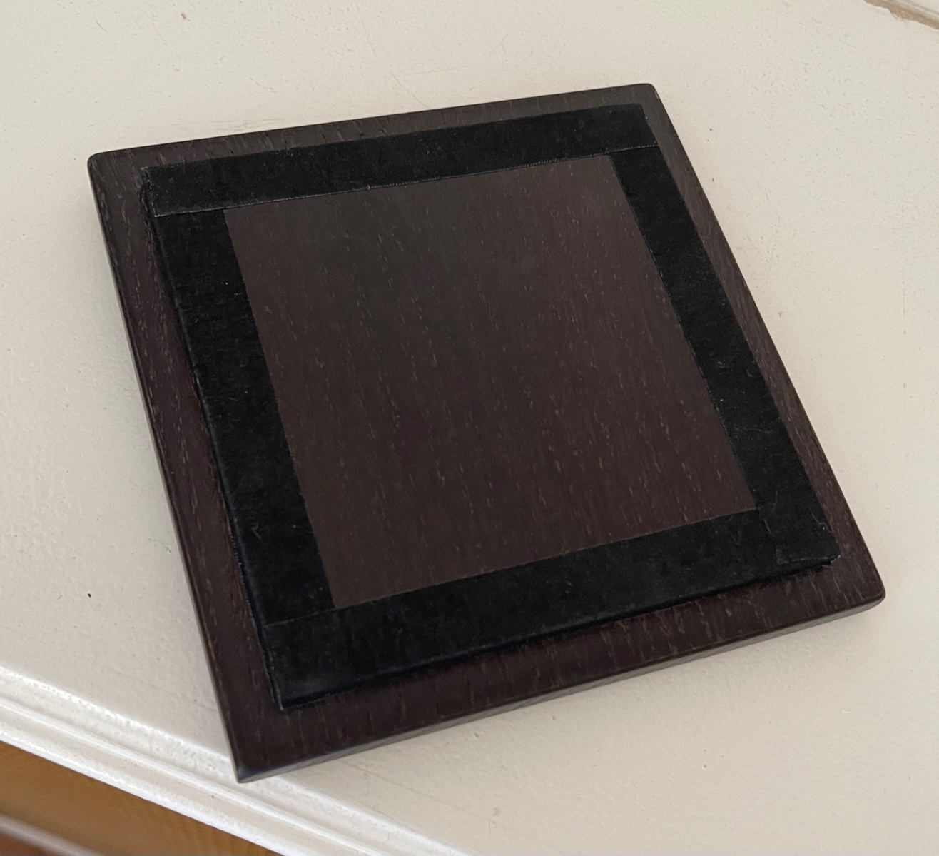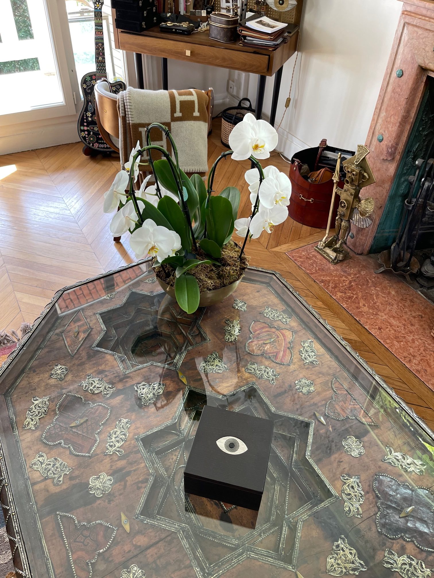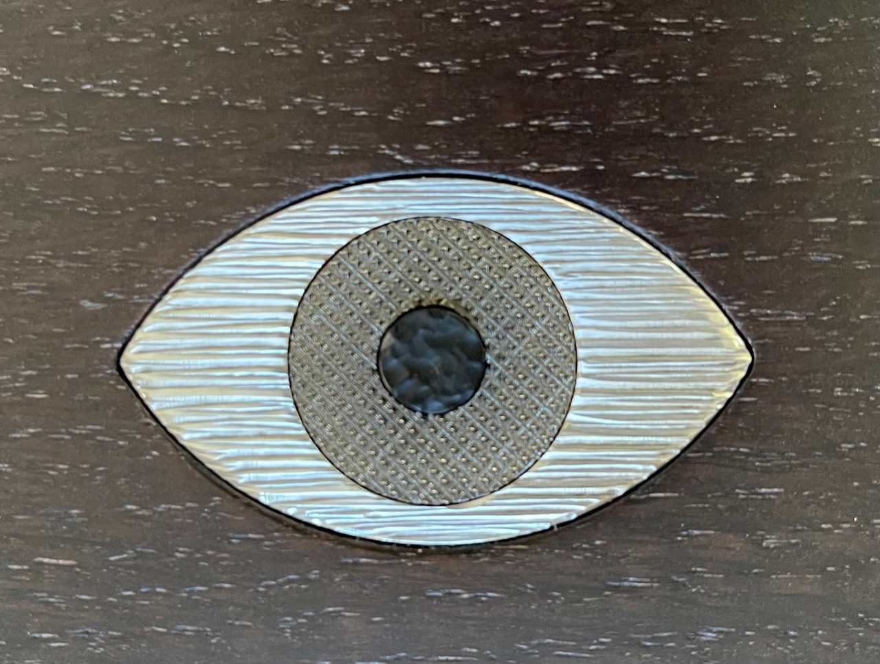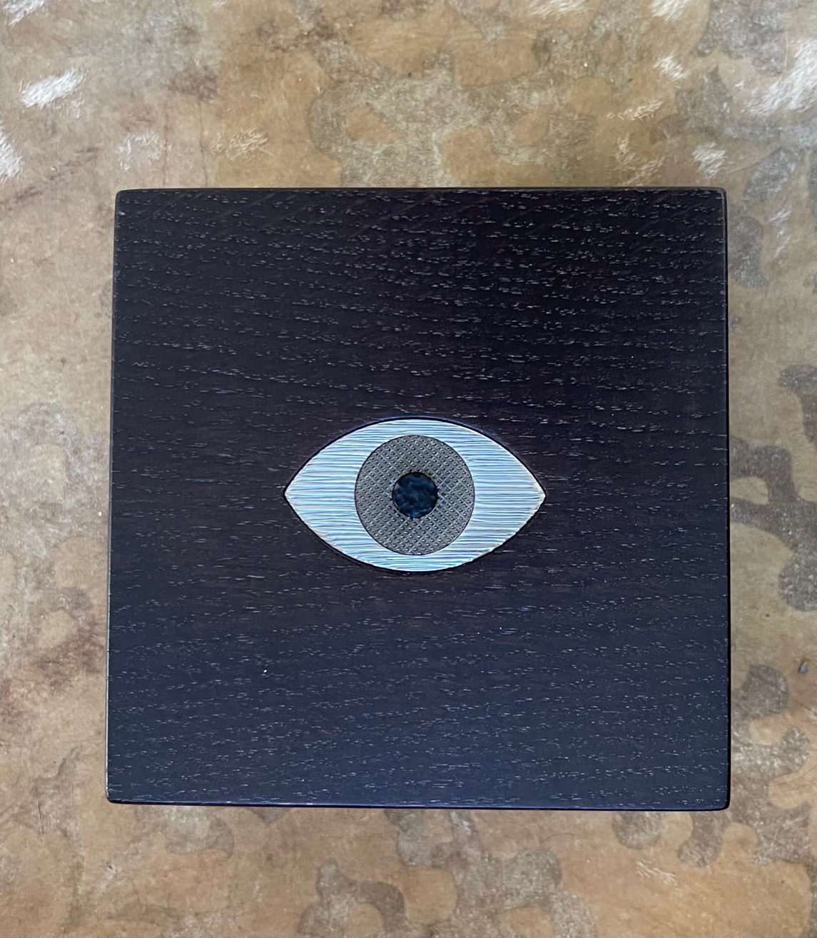 Cette boite est composée de deux parties en chêne massif teinté wengé avec en son centre un Oeil en laiton massif gravé de trois différents motifs dans les tons froids old silver :