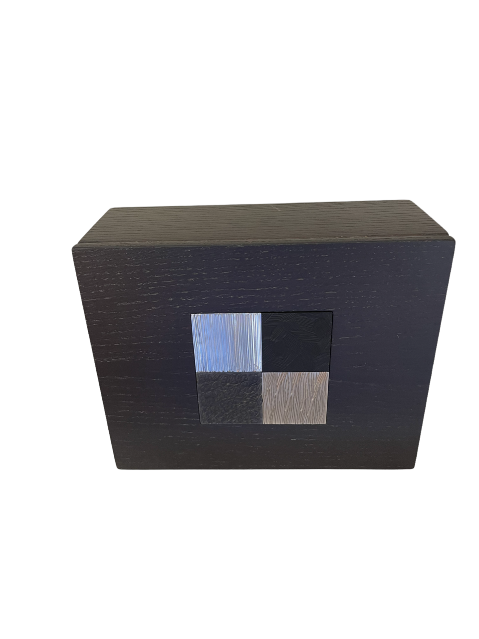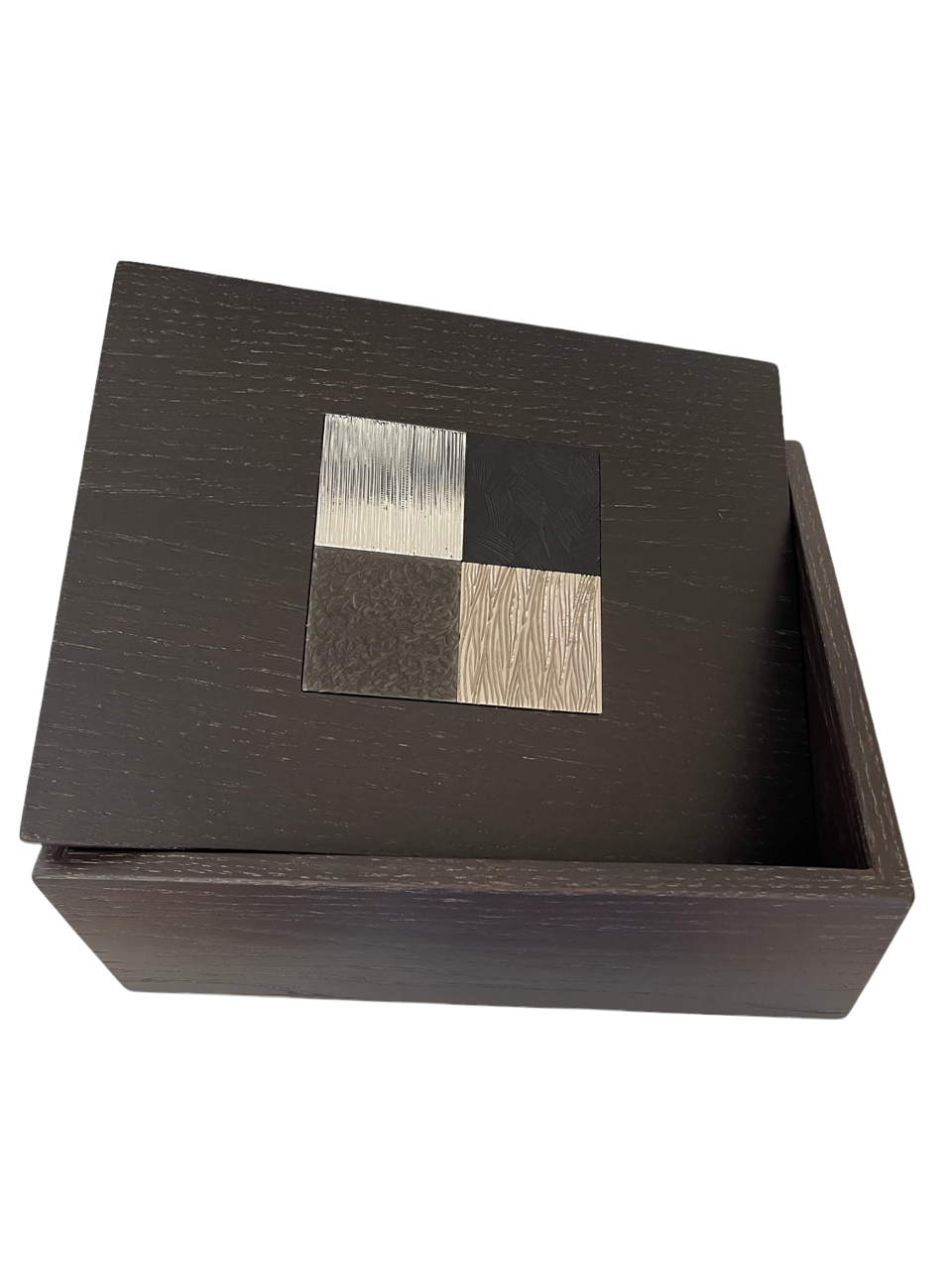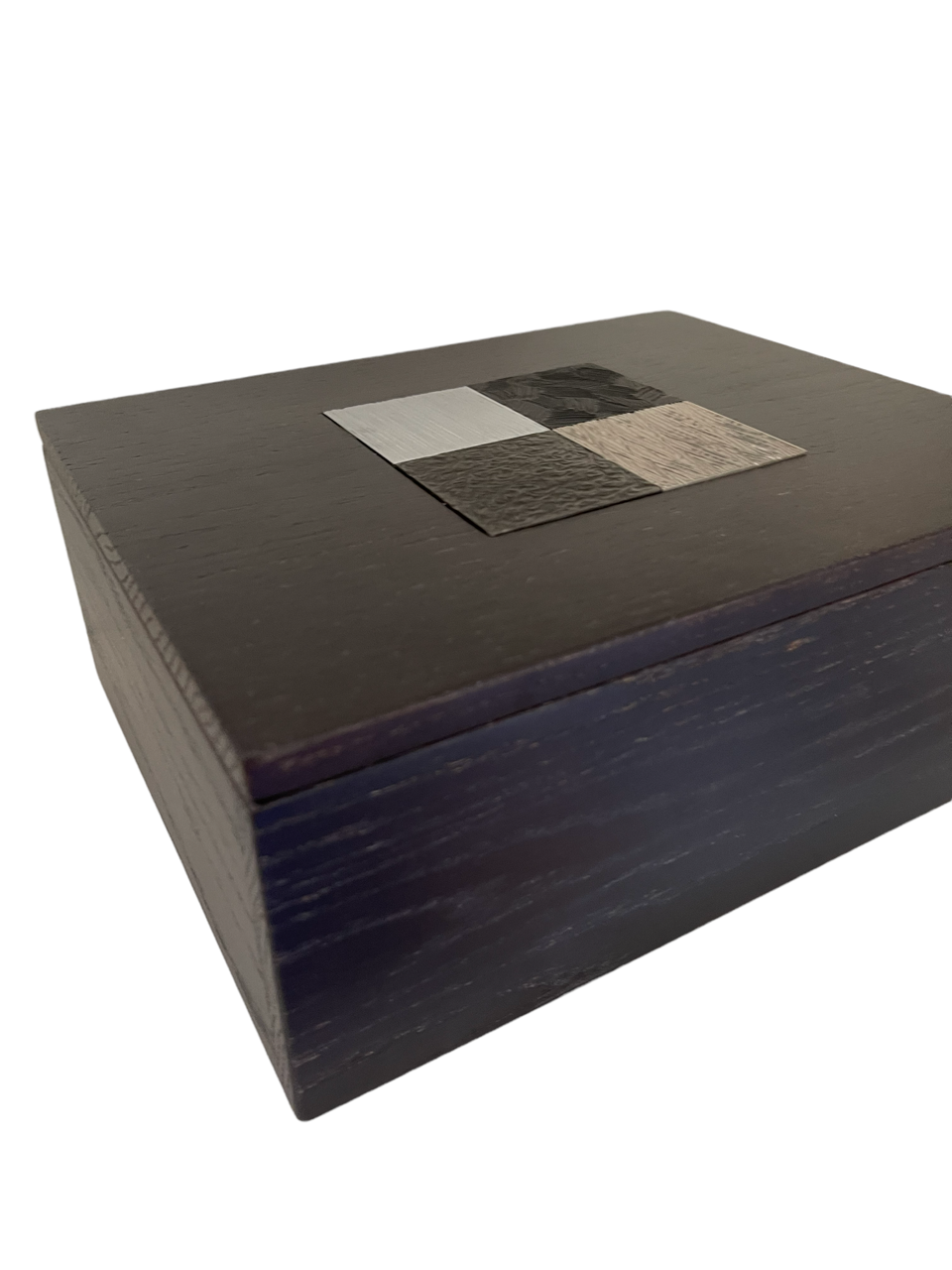 Cette boite est composée de deux parties en chêne massif teinté wengé avec en son centre une mosaïque de 4 carrés en laiton gravés, dans une dominante de tons froids :