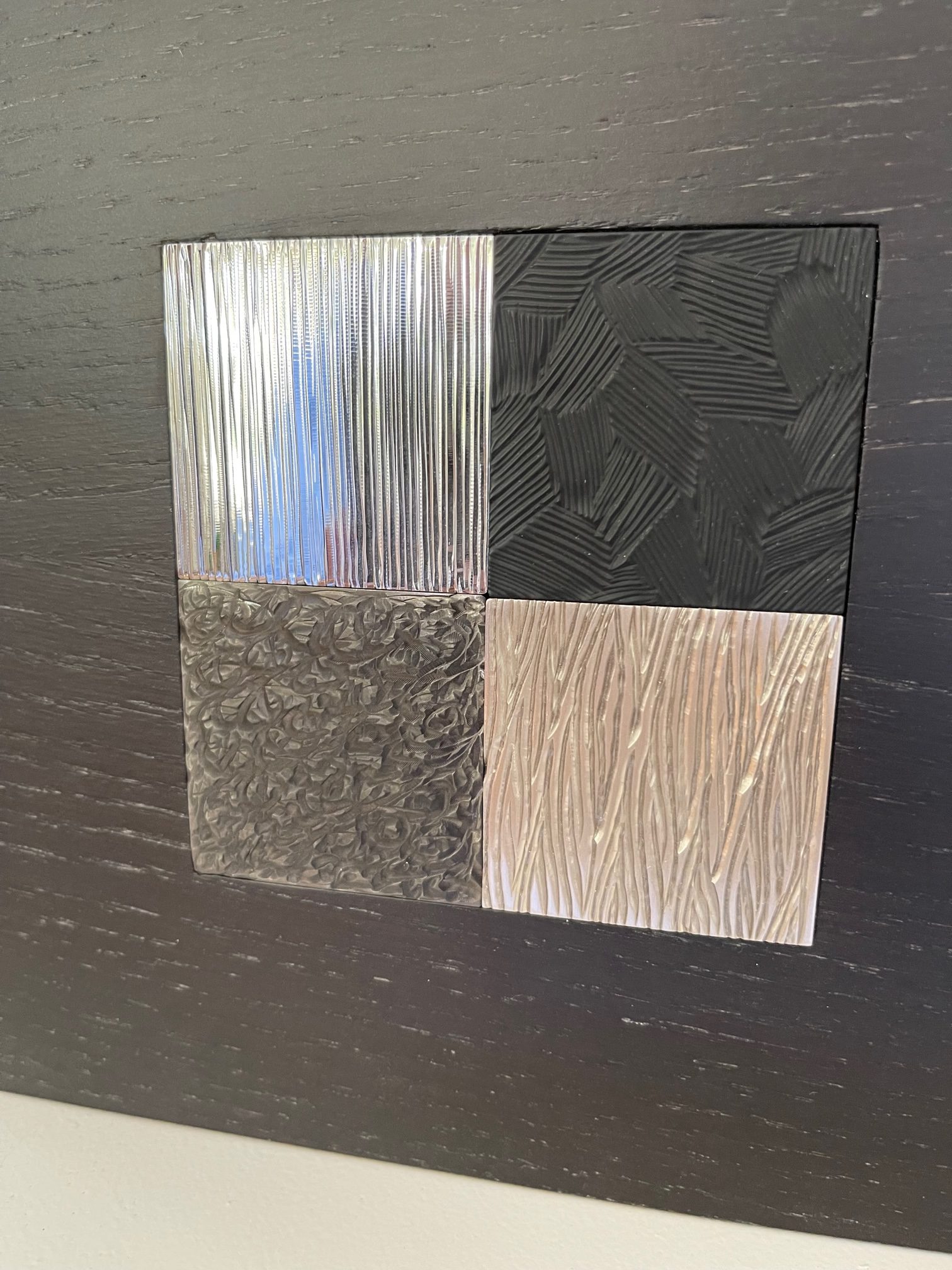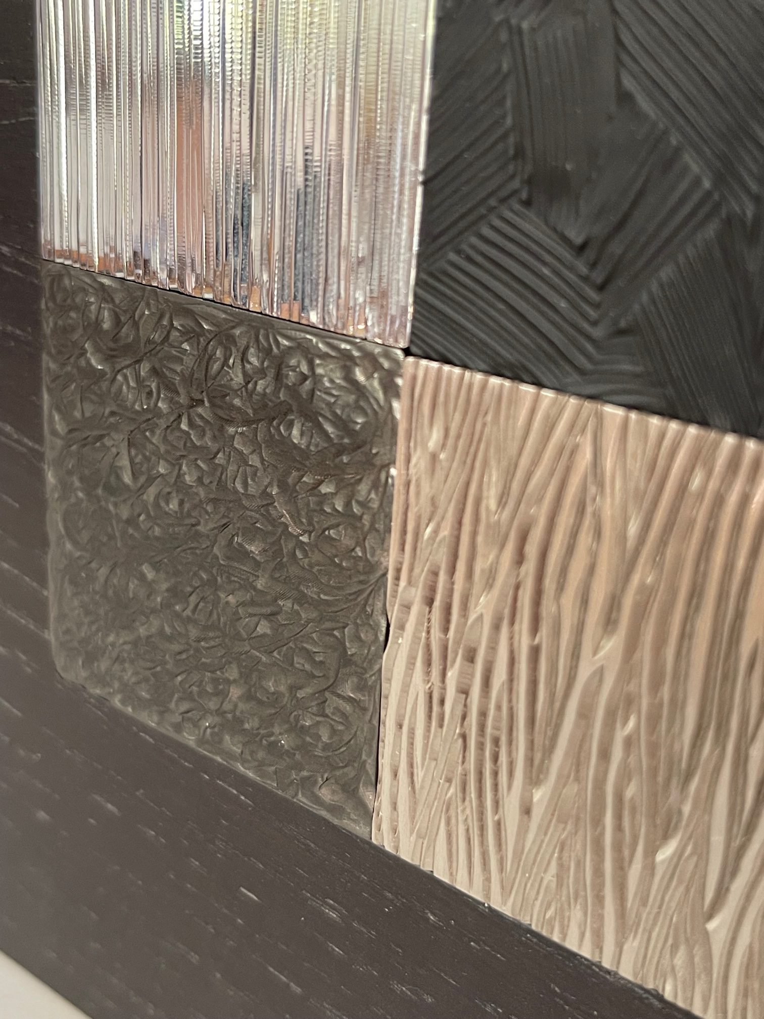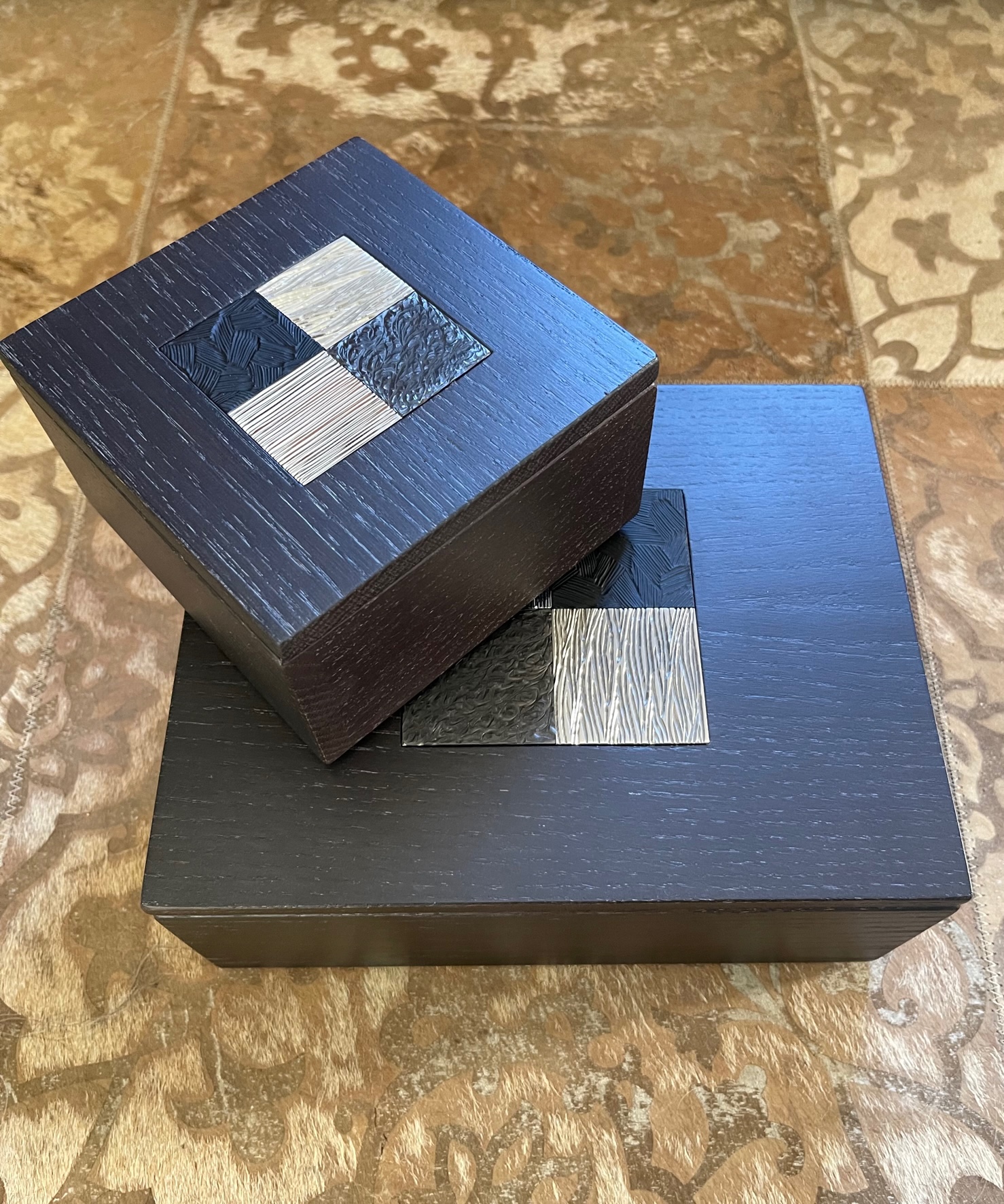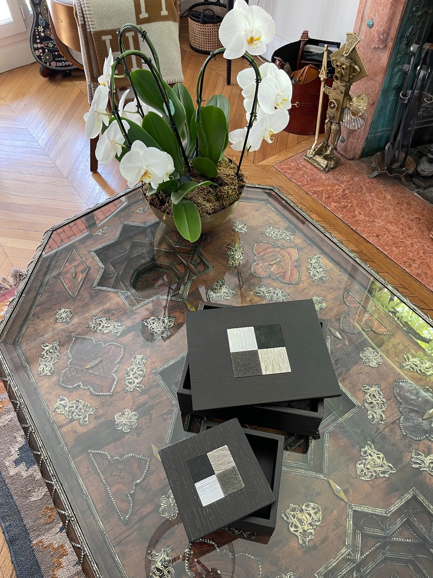 Cette boite est composée de deux parties en chêne massif teinté wengé avec en son centre une mosaïque de 4 carrés en laiton gravés, dans une dominante de tons froids :