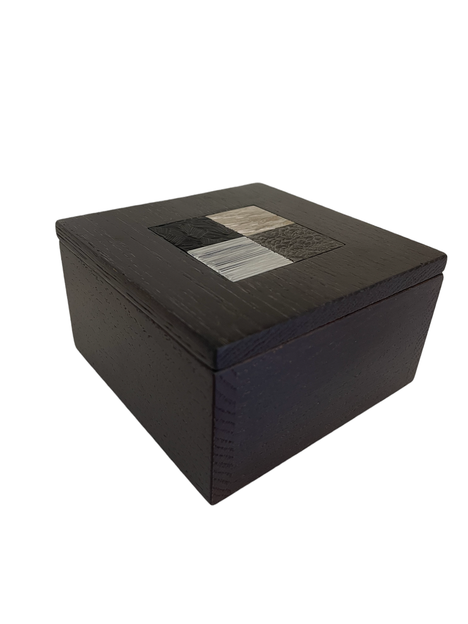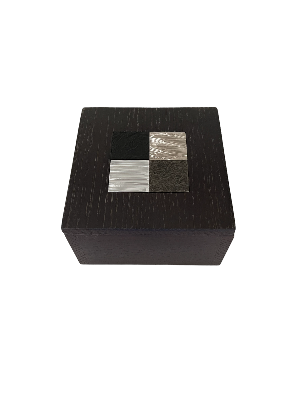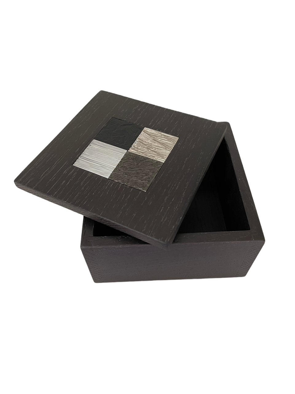 Cette boite est composée de deux parties en chêne massif teinté wengé avec en son centre une mosaïque de 4 carrés en laiton gravés, dans une dominante de tons ors :