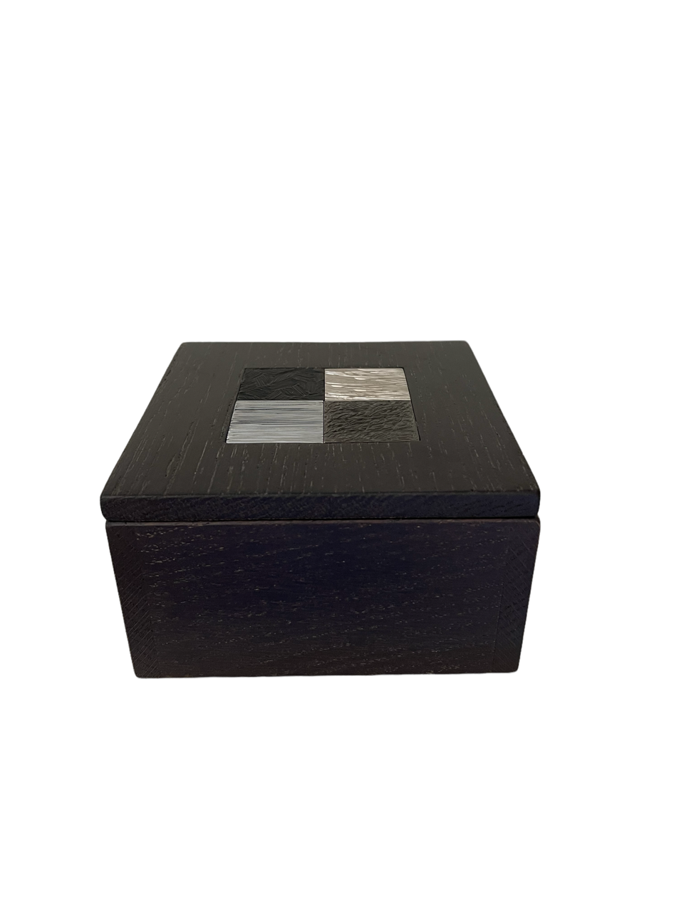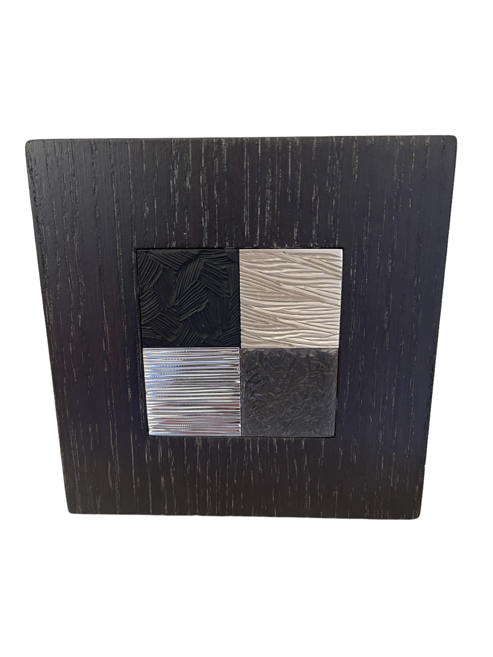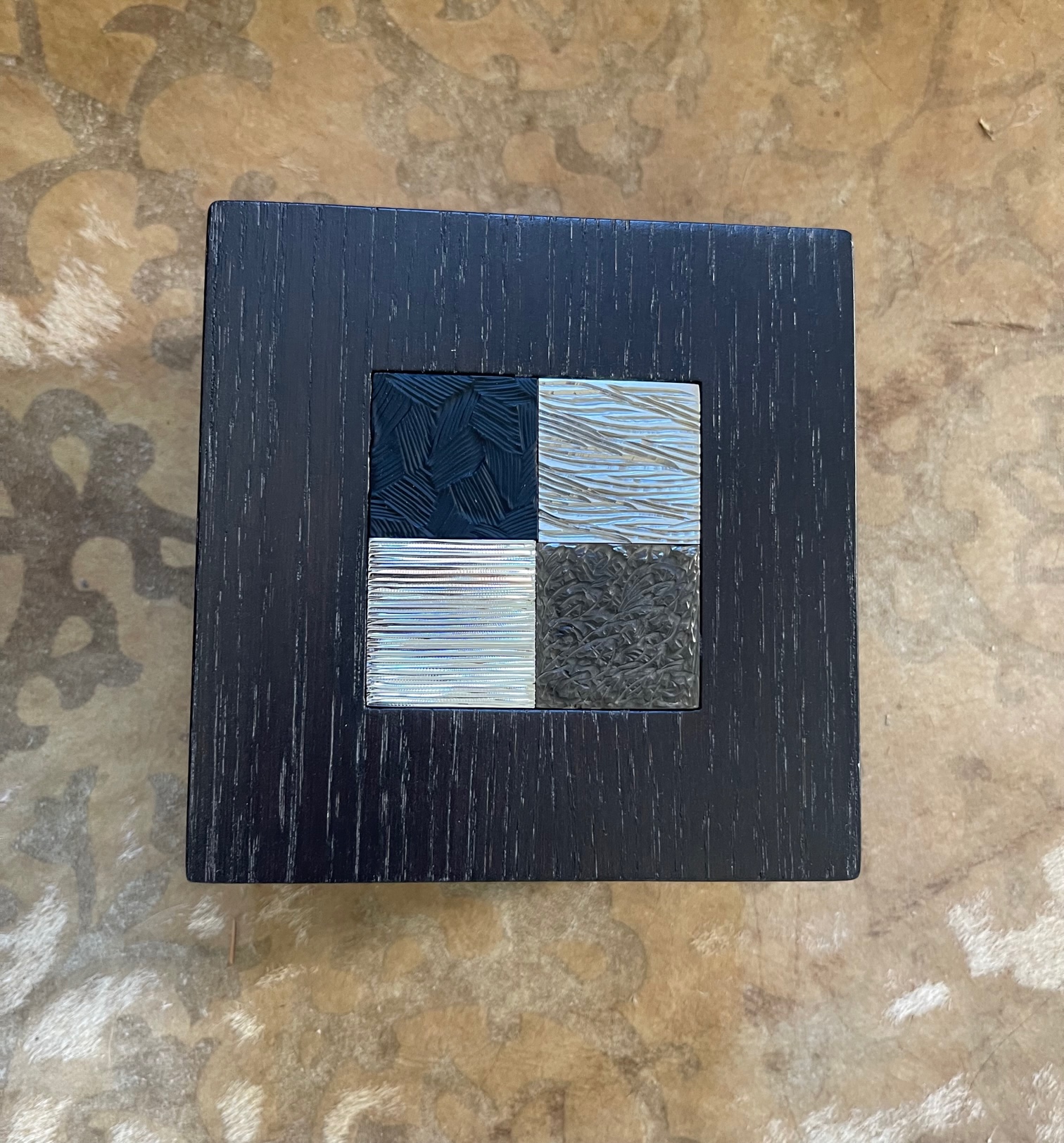 Cette boite est composée de deux parties en chêne massif teinté wengé avec en son centre une mosaïque de 4 carrés en laiton gravés, dans une dominante de tons ors :