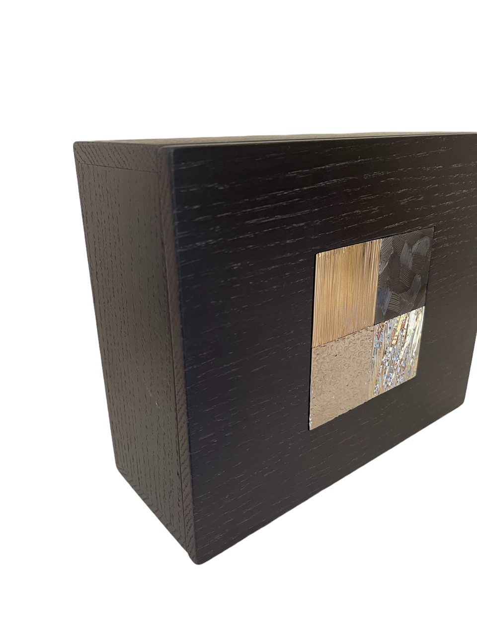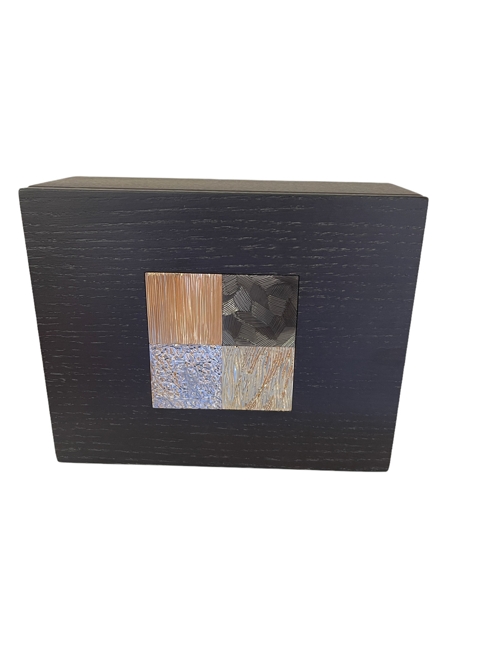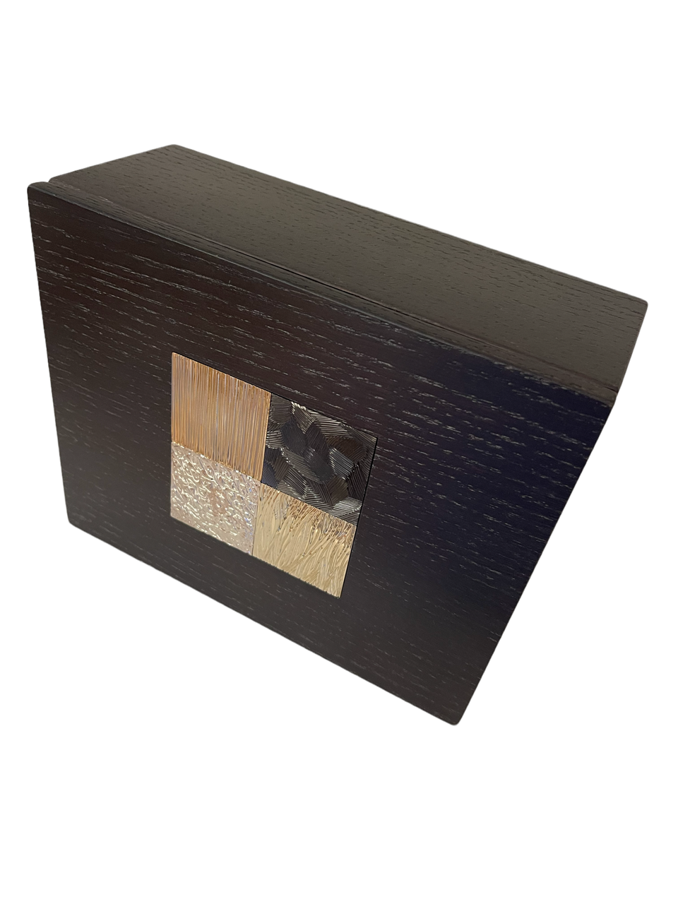 Cette boite est composée de deux parties en chêne massif teinté wengé avec en son centre une mosaïque de 4 carrés en laiton gravés, dans une dominante de tons ors :