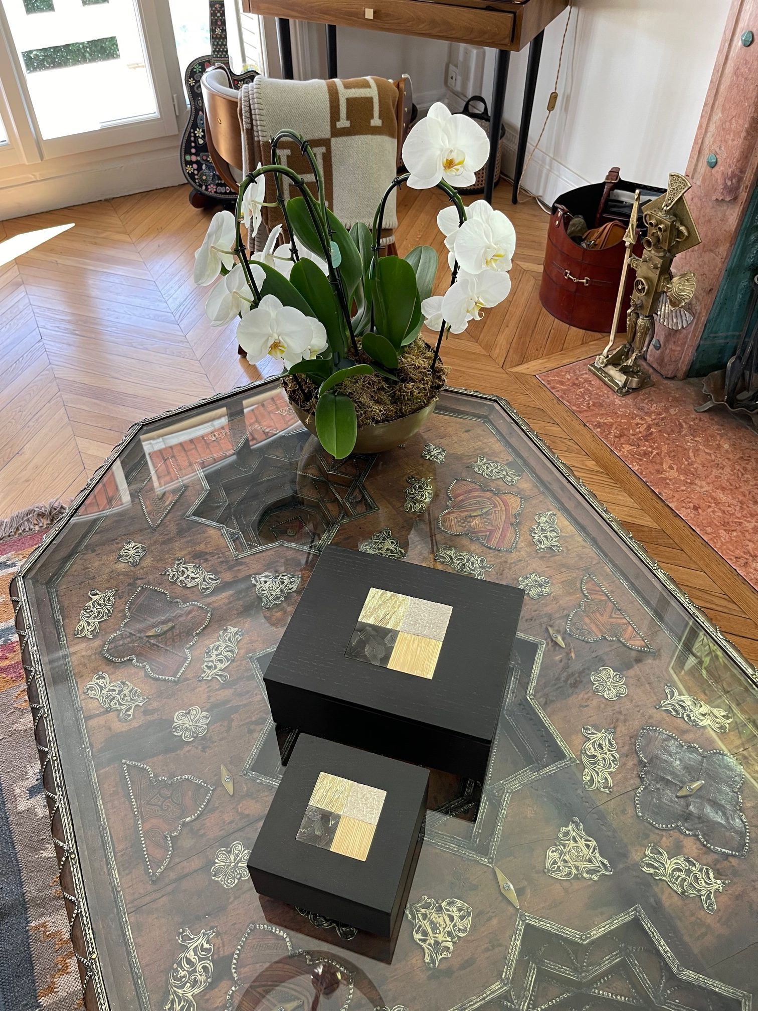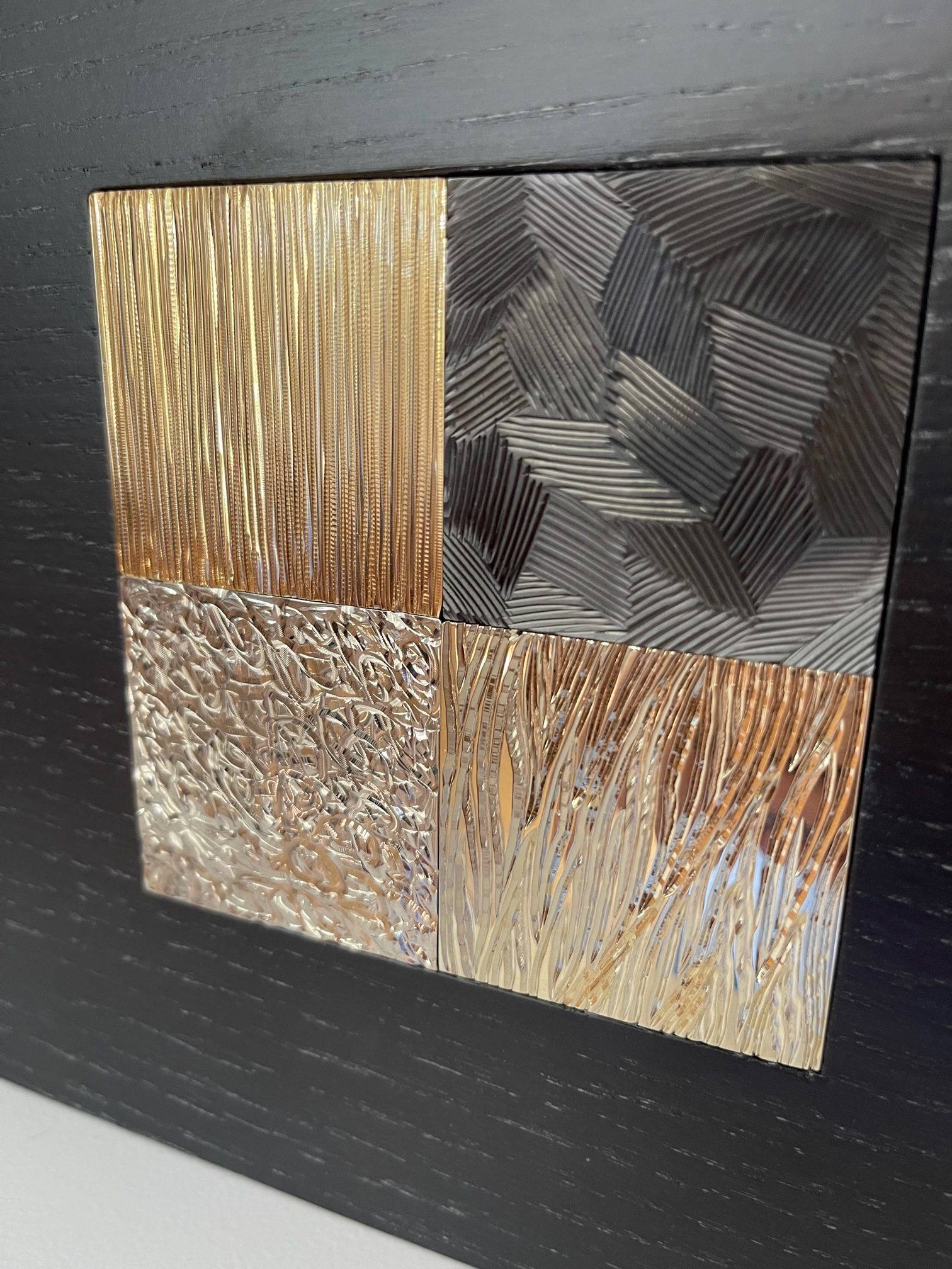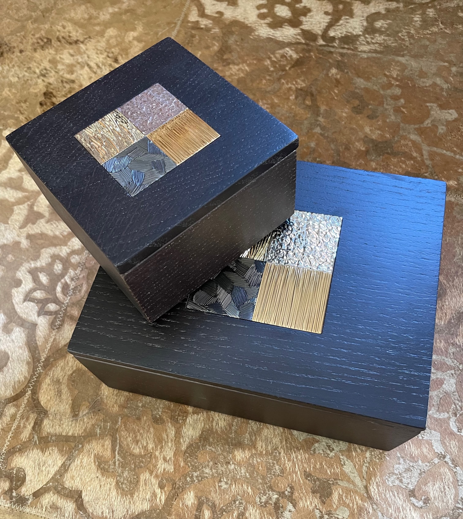 Cette boite est composée de deux parties en chêne massif teinté wengé avec en son centre une mosaïque de 4 carrés en laiton gravés, dans une dominante de tons ors :