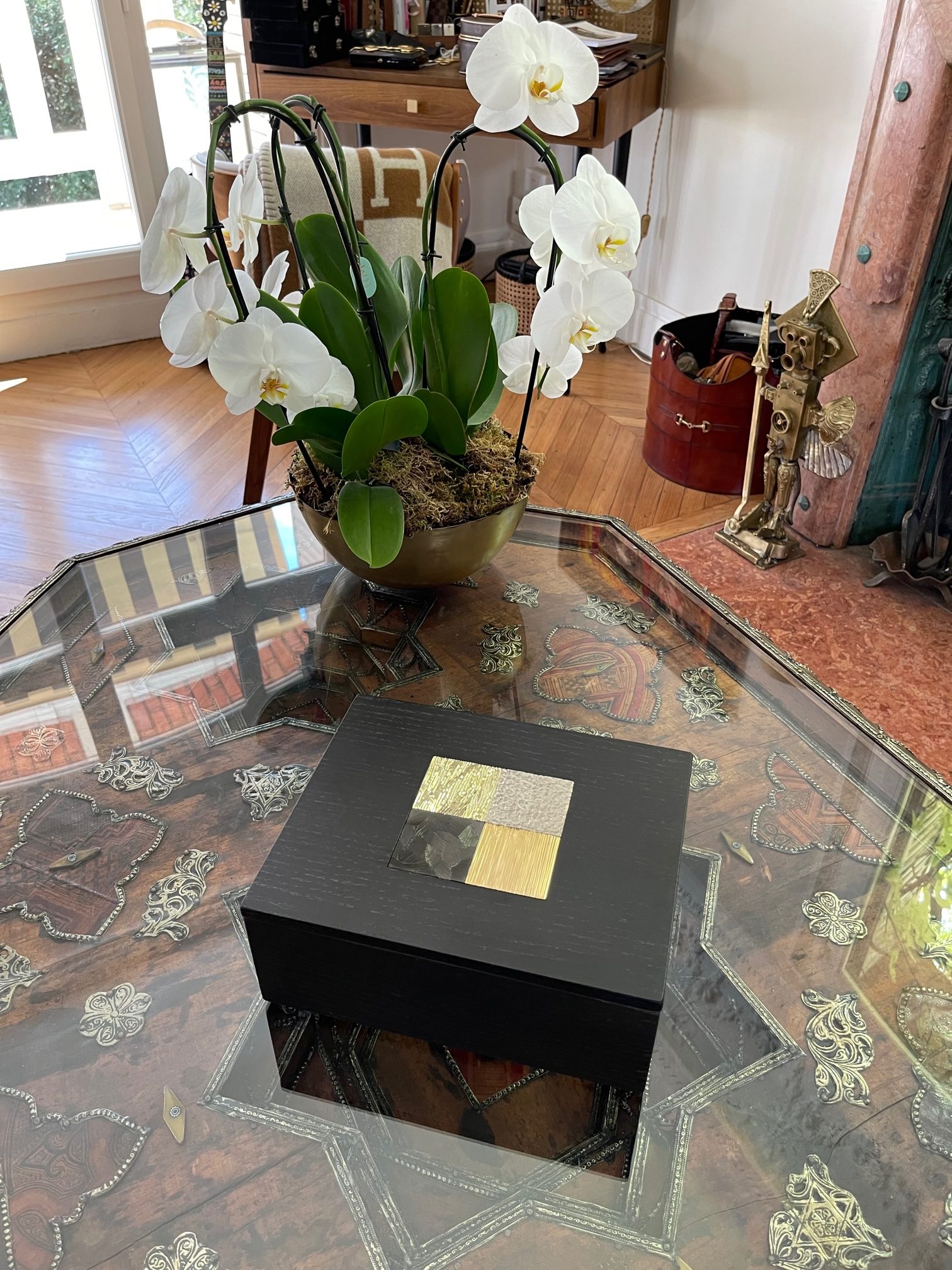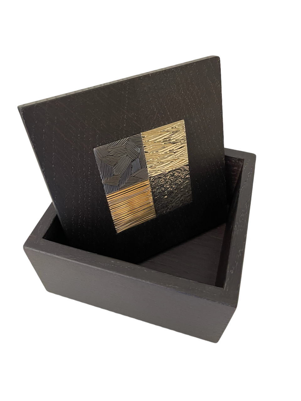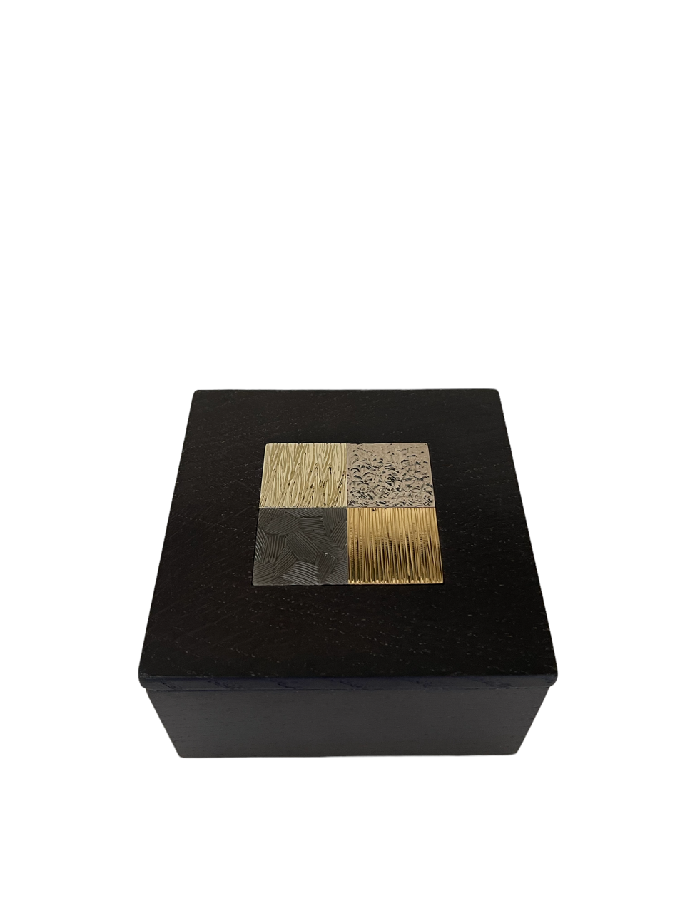 Cette boite est composée de deux parties en chêne massif teinté wengé avec en son centre une mosaïque de 4 carrés en laiton gravés, dans une dominante de tons ors :