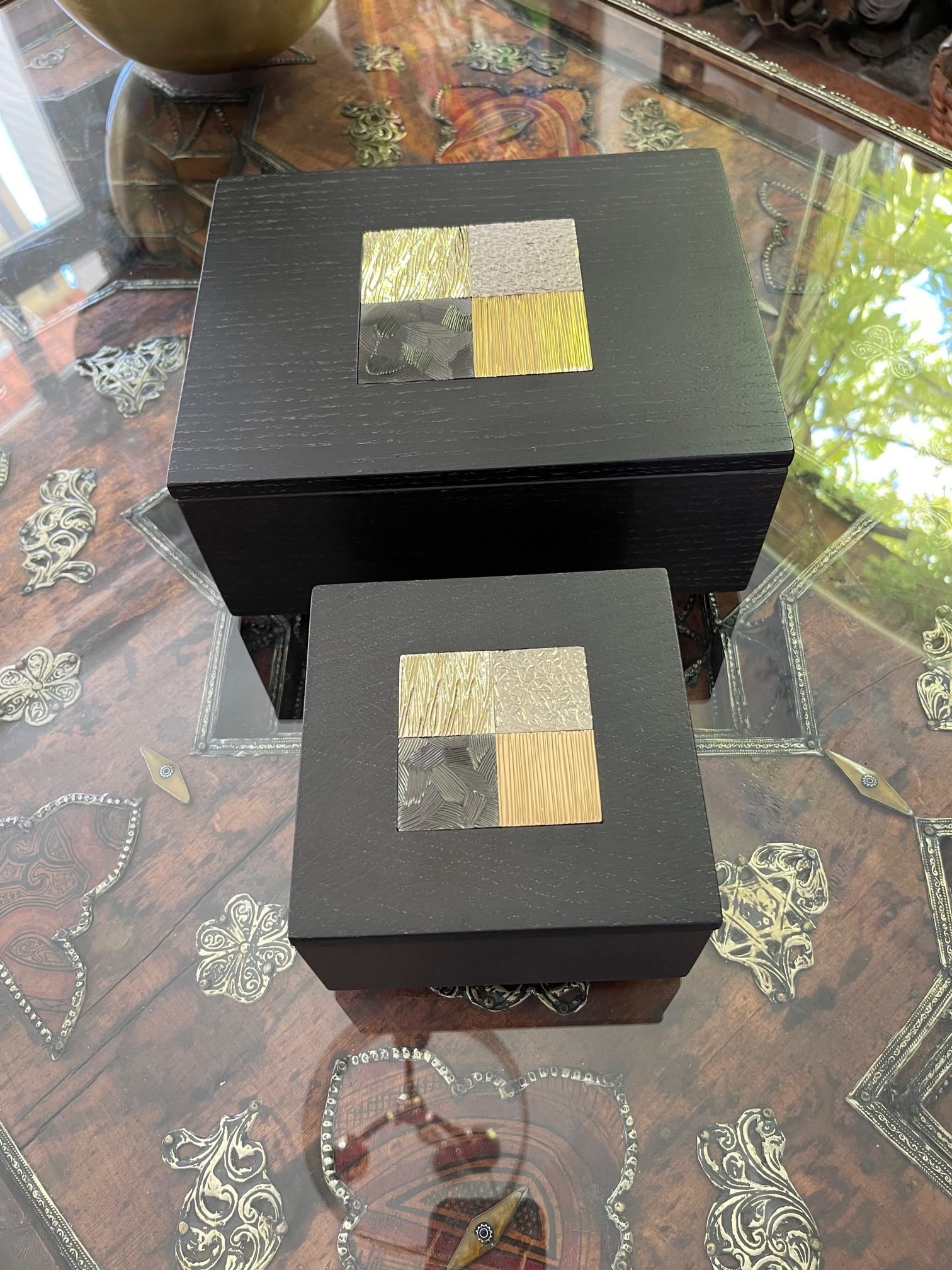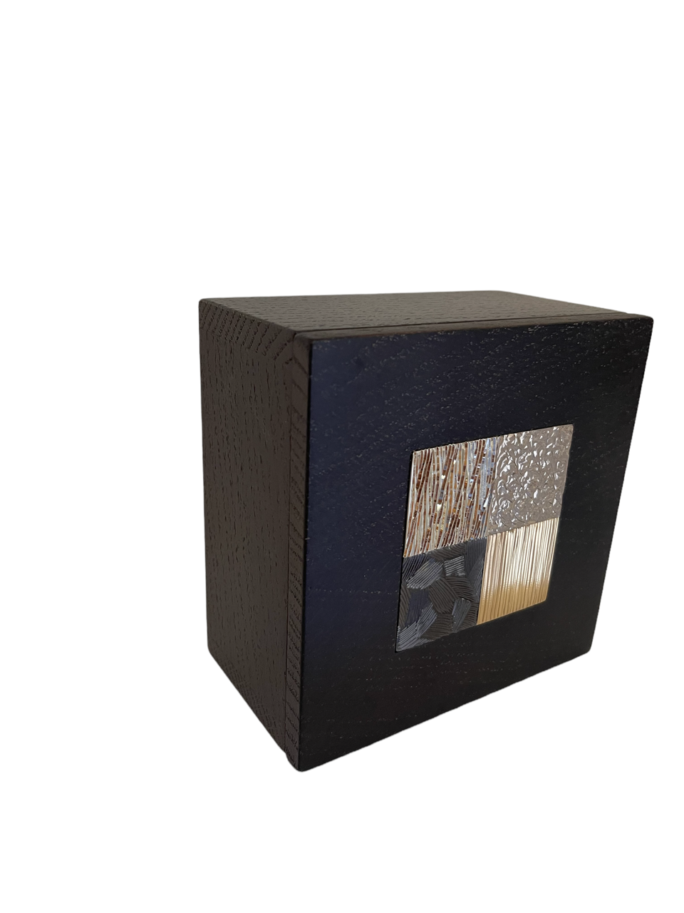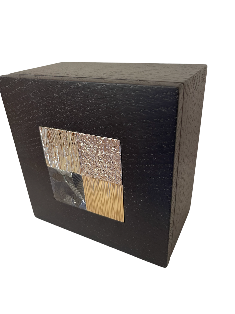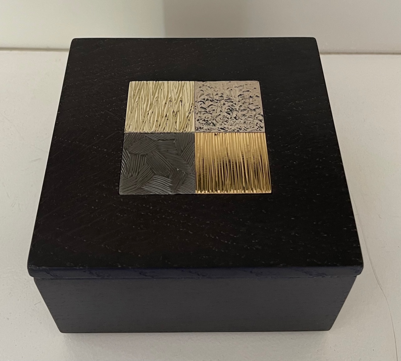 Cette boite est composée de deux parties en chêne massif teinté wengé avec en son centre une mosaïque de 4 carrés en laiton gravés, dans une dominante de tons ors :