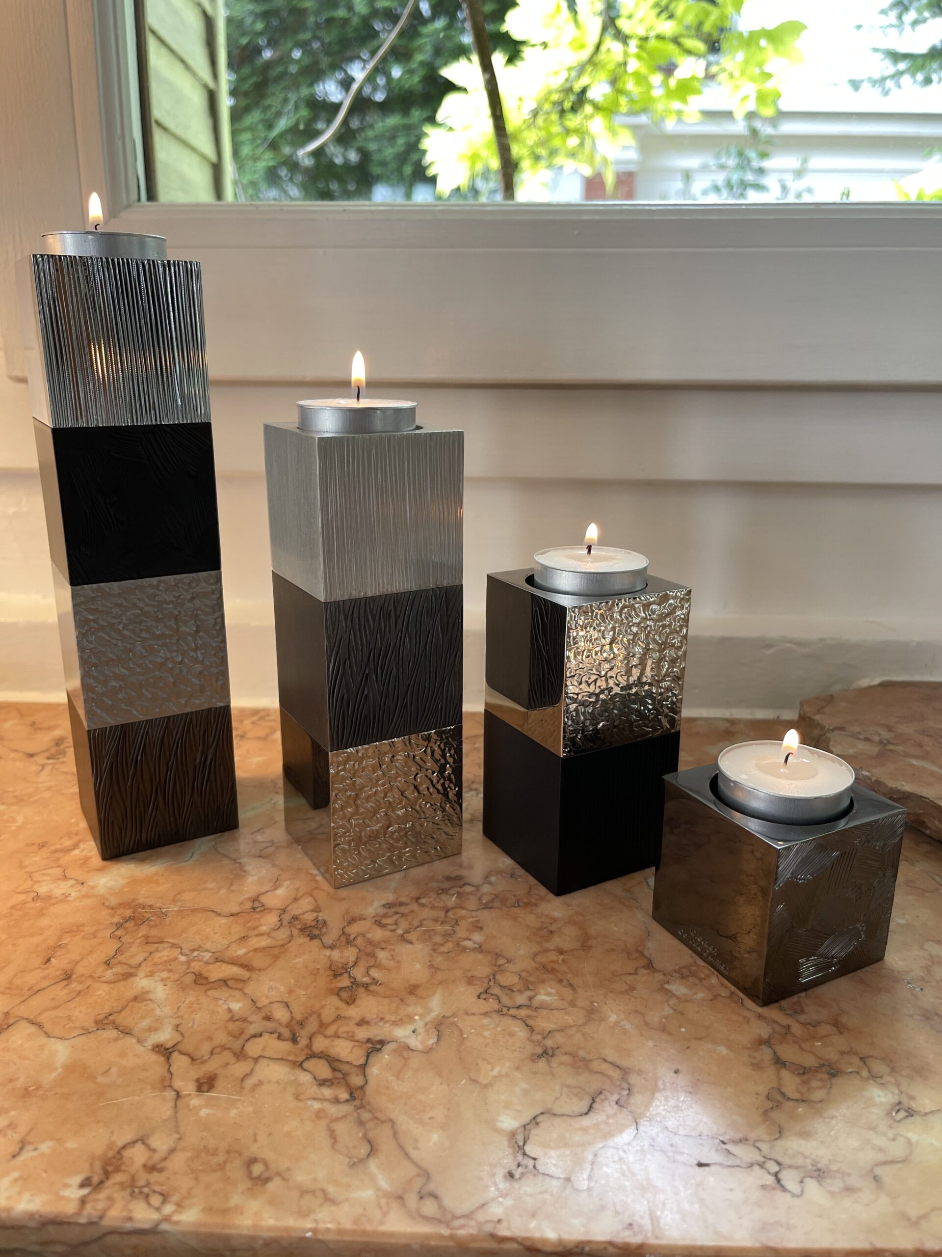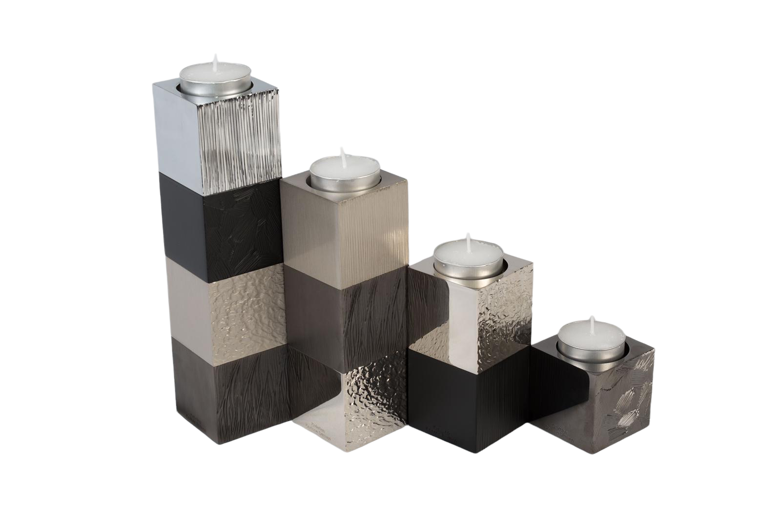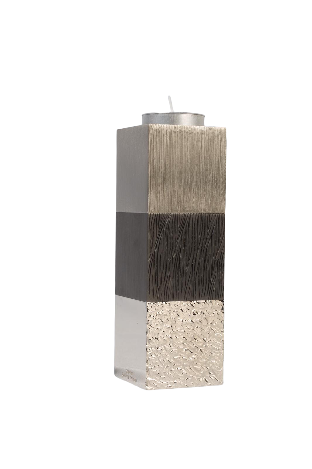 Bougeoir carré 3 modules en laiton massif Nickel brillant, gun metal et nickel mat, gravés sur deux faces et deux faces lisses.
