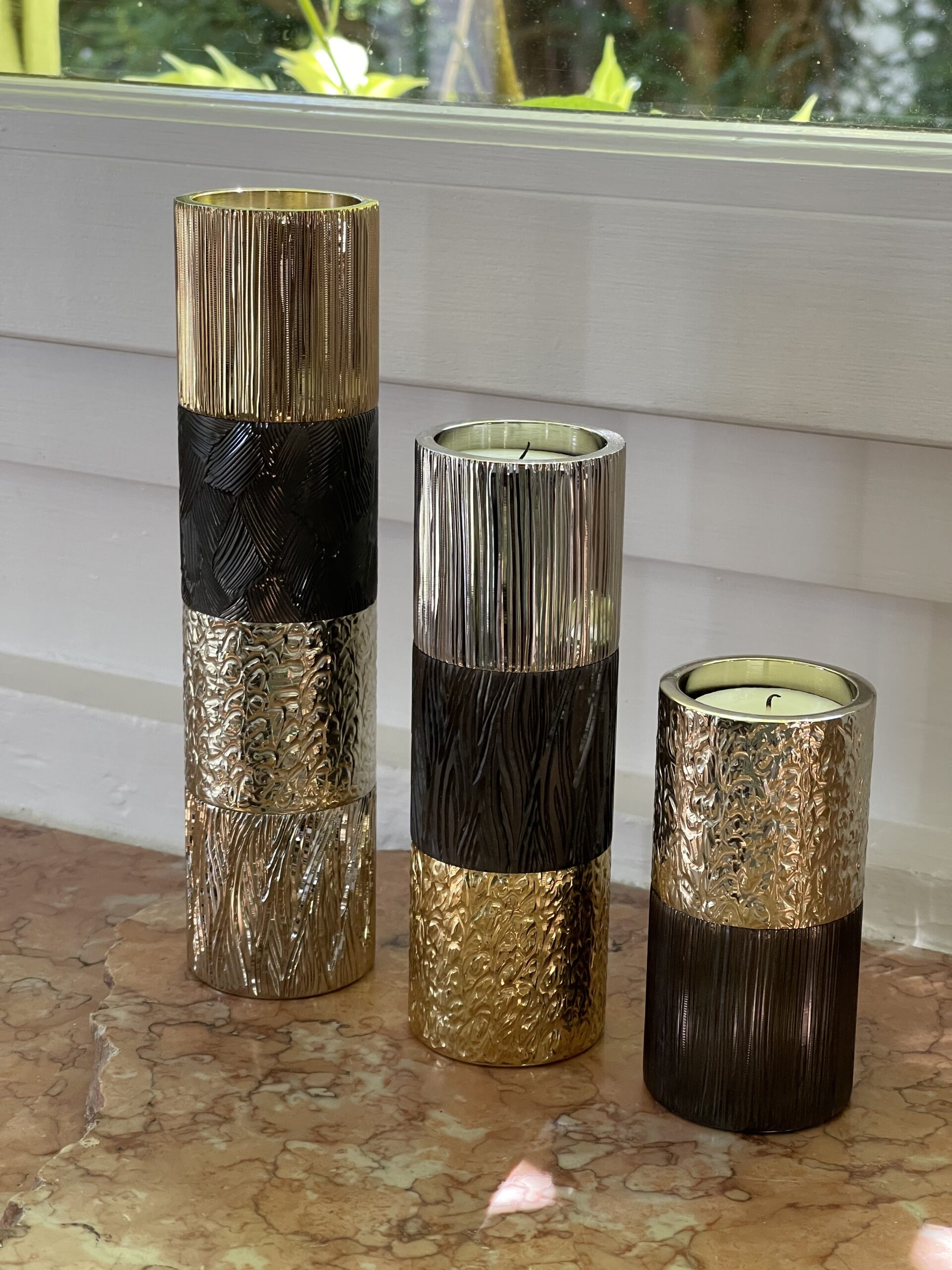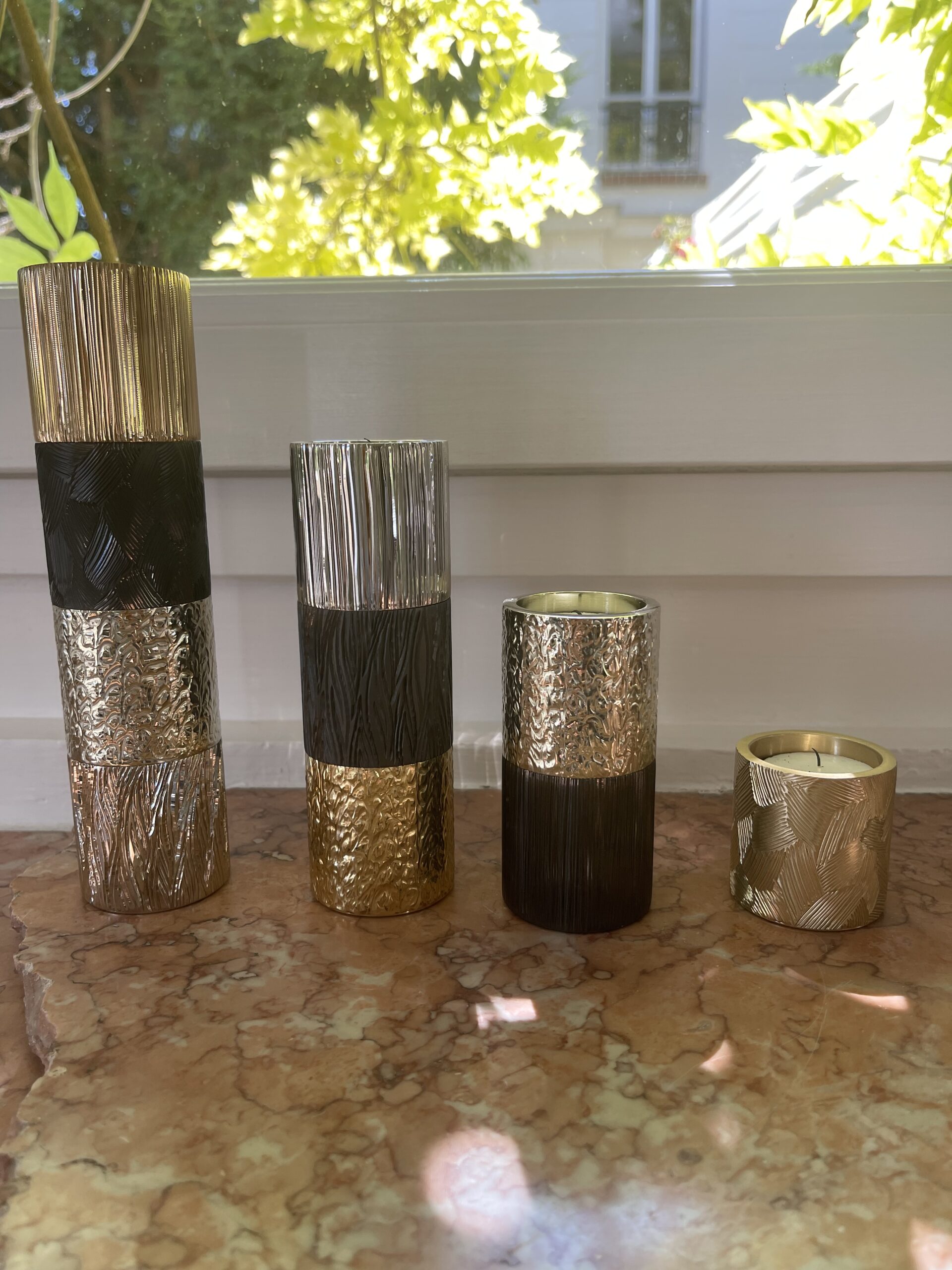 Bougeoir Mez rond 2 modules gravés en laiton massif gun metal et champagne.