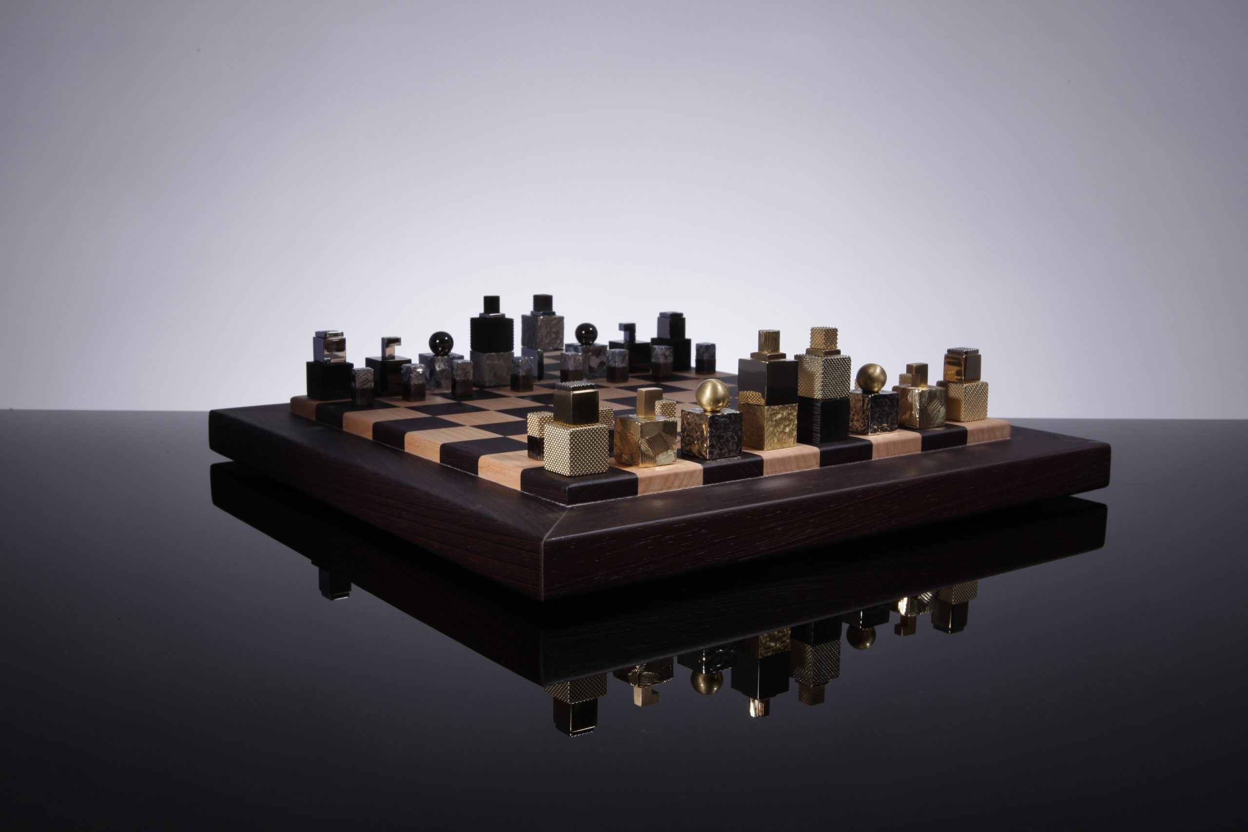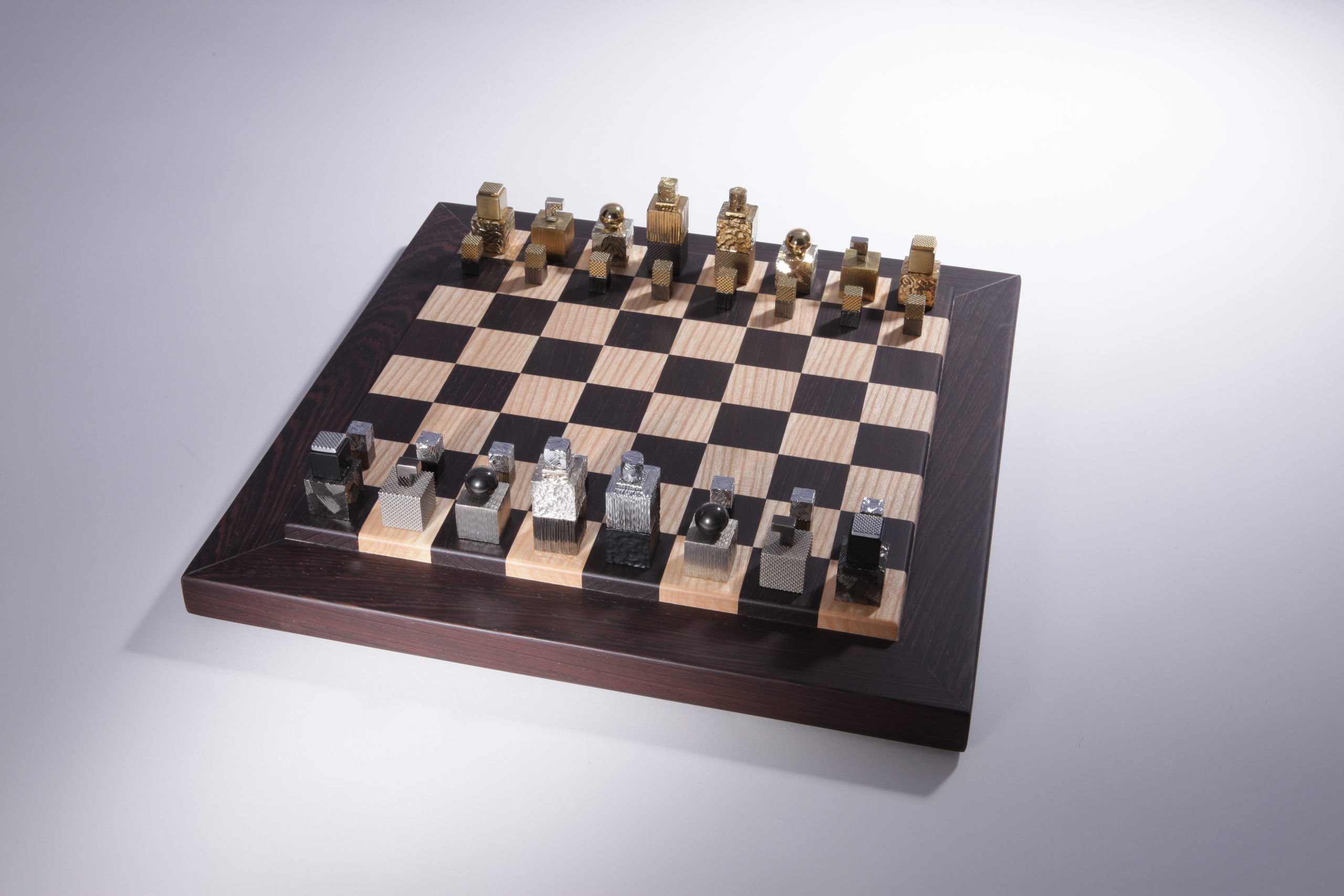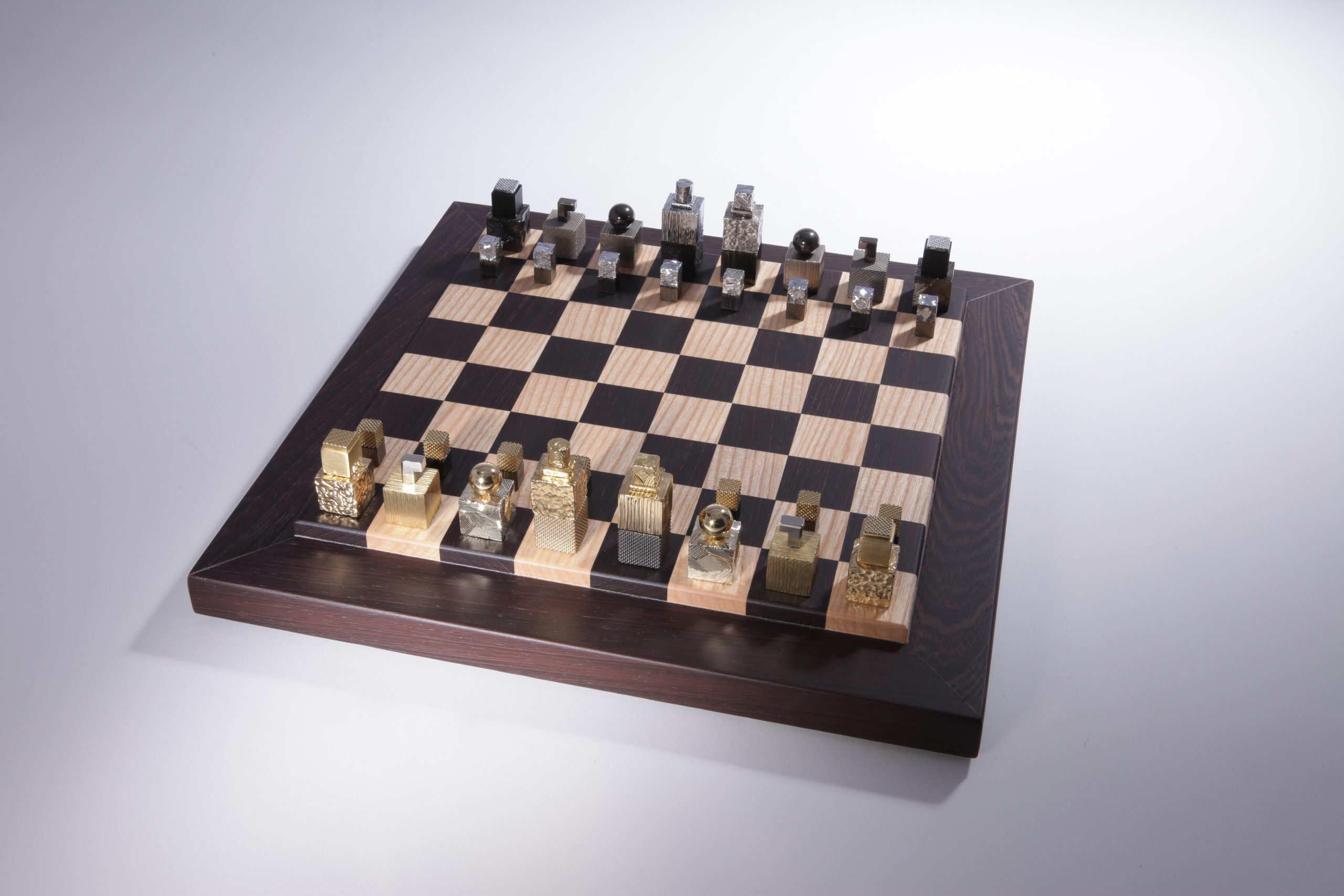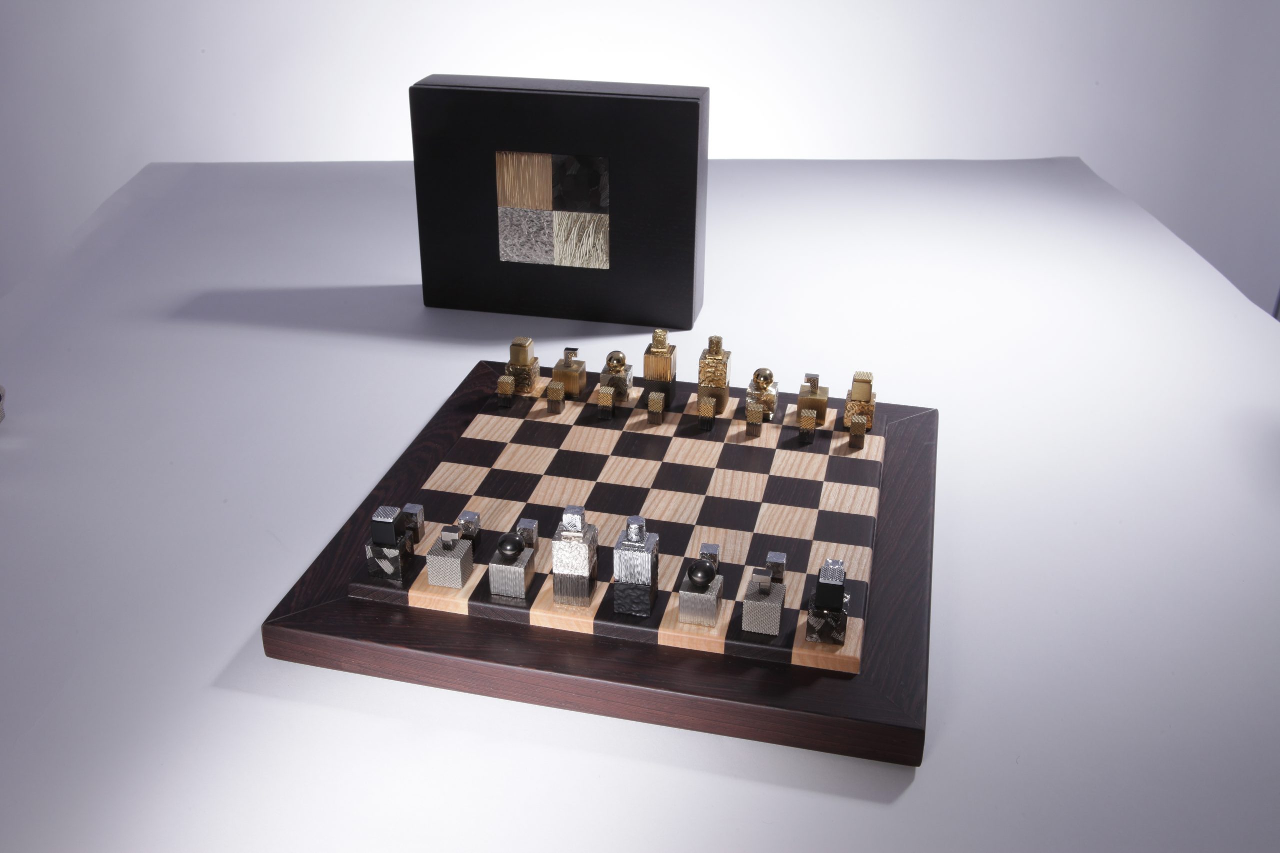 Le jeu est livré avec une boite écrin avec insert de laiton gravé et un plateau en bois façonné à la main en bois wengé et châtaignier par des artisans ébénistes.  Chaque pièce composant le jeu d’échecs est unique et des variations de teintes de bois peuvent apparaitre, les photos des plateaux et des boites sont non contractuelles.