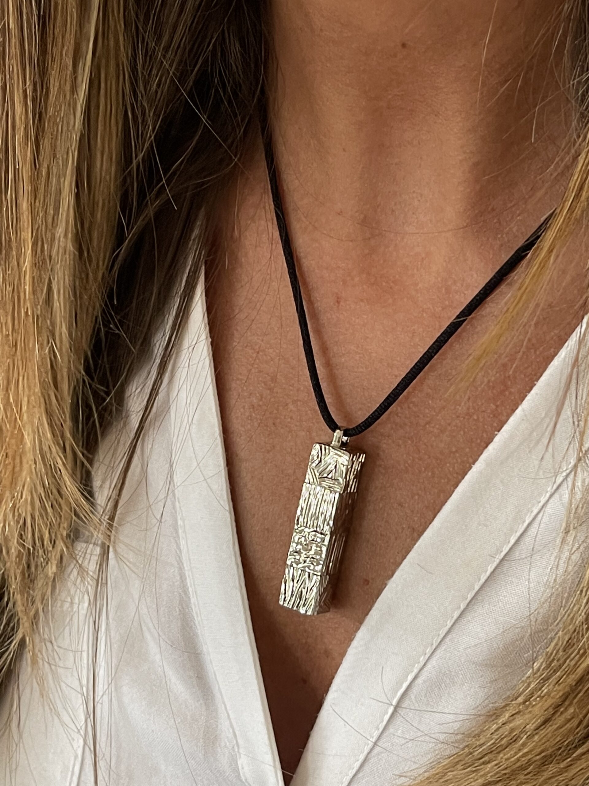 Les quatre parties du pendentif sont gravées, polies et assemblées à la main.
