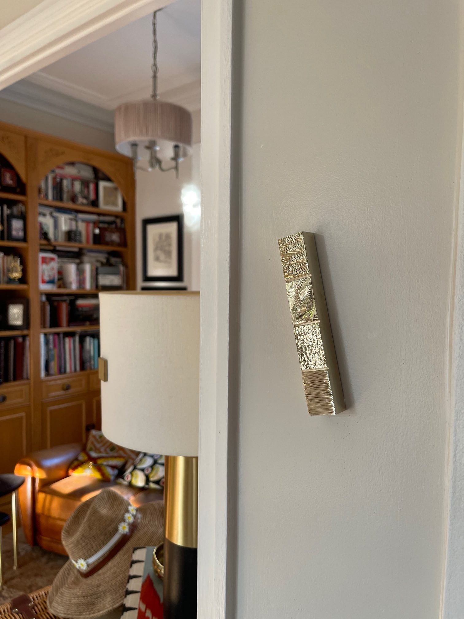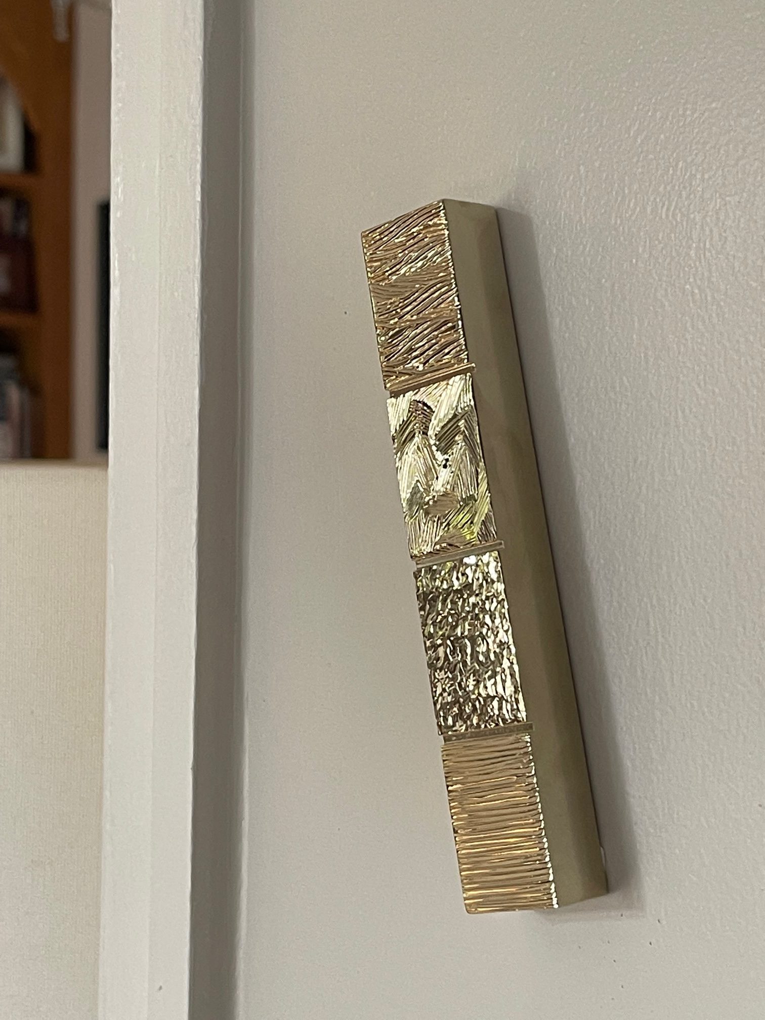Mezouza Mez en laiton massif gravé champagne avec 4 motifs différents.