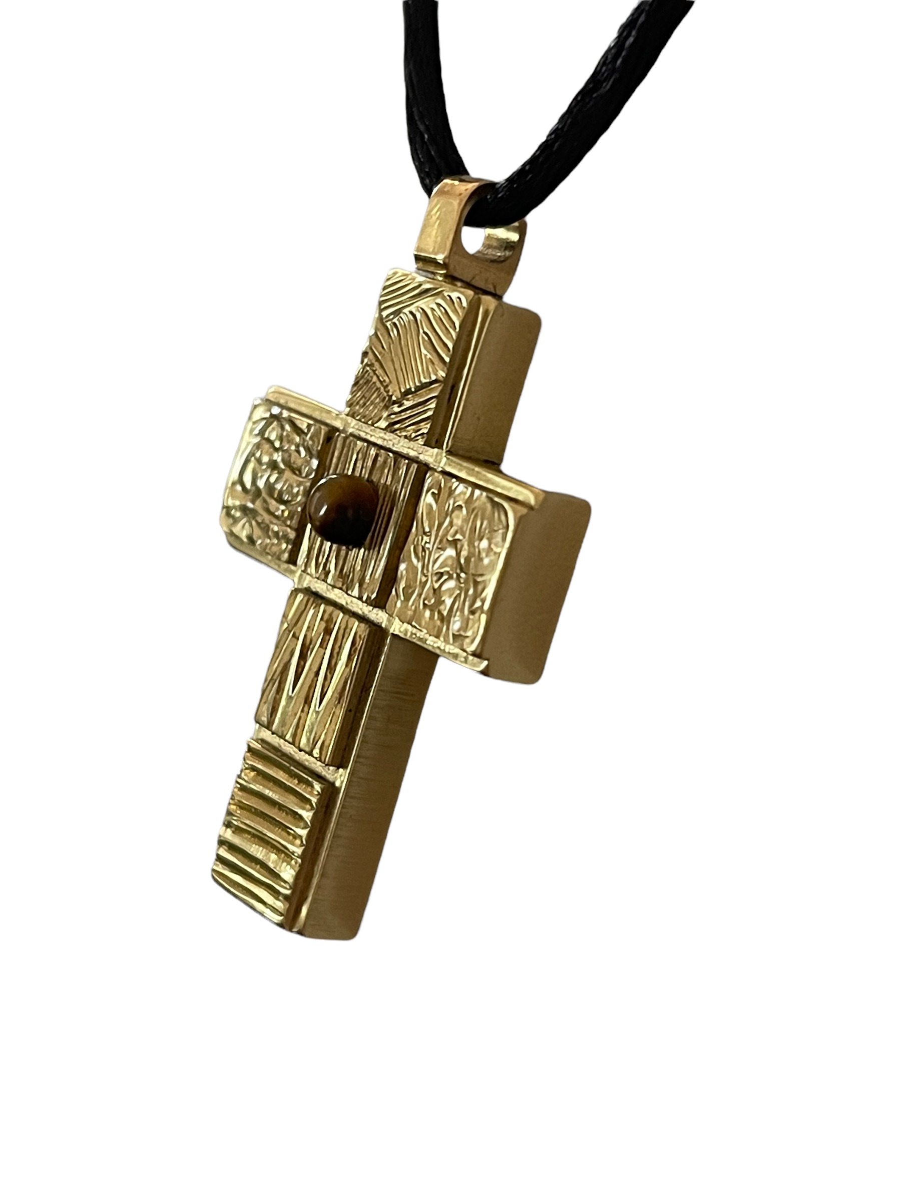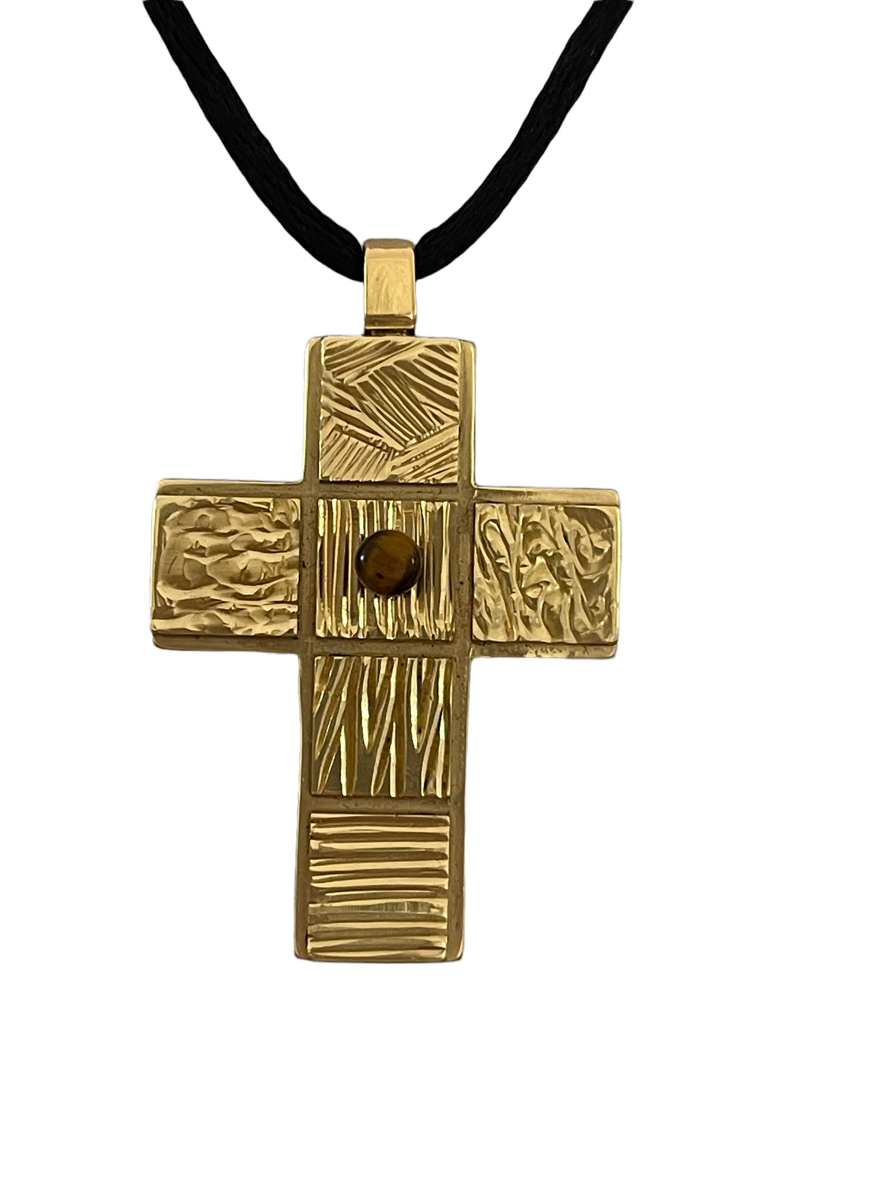 Pendentif Cross – Croix en laiton gravé 6 motifs et oeil de tigre