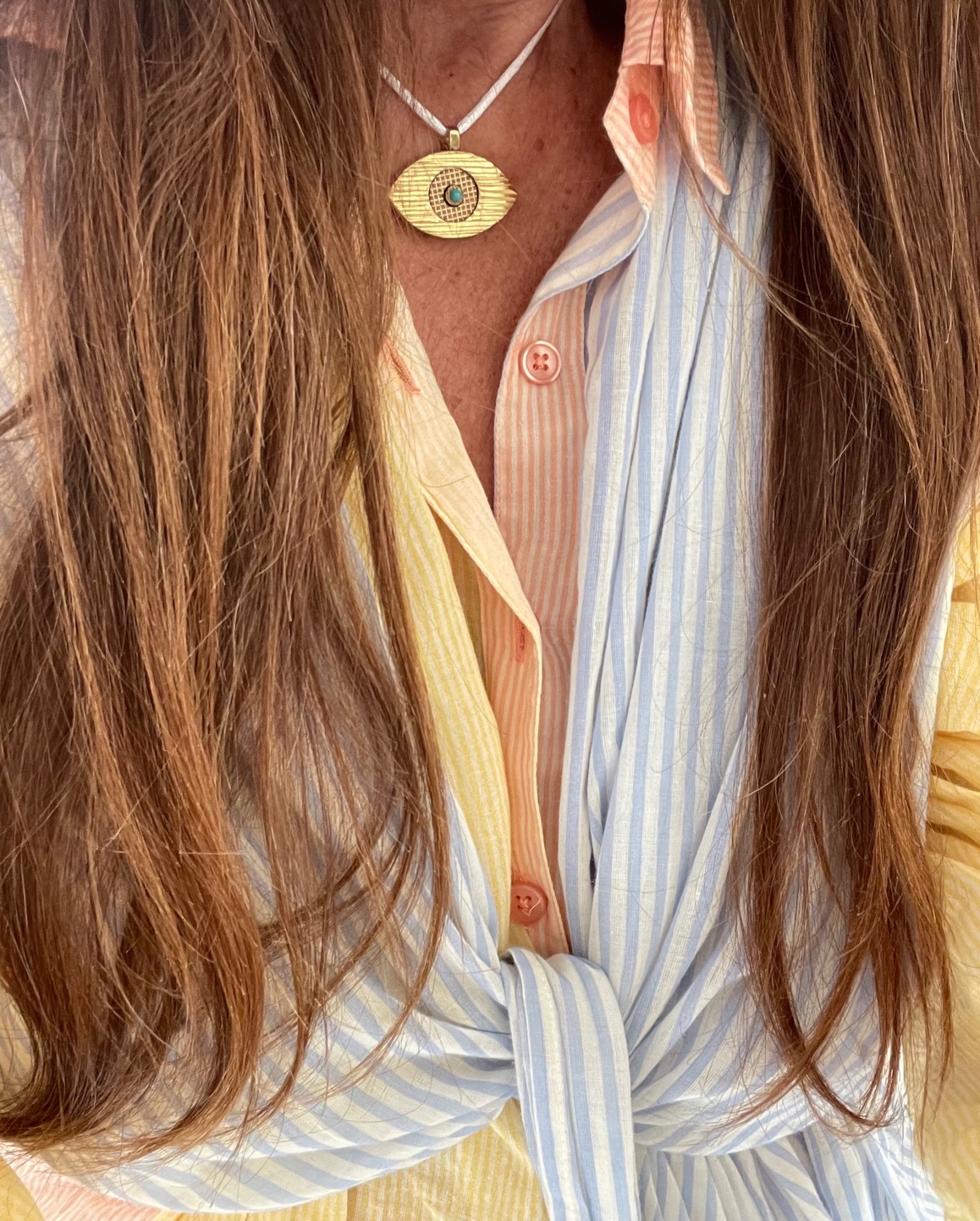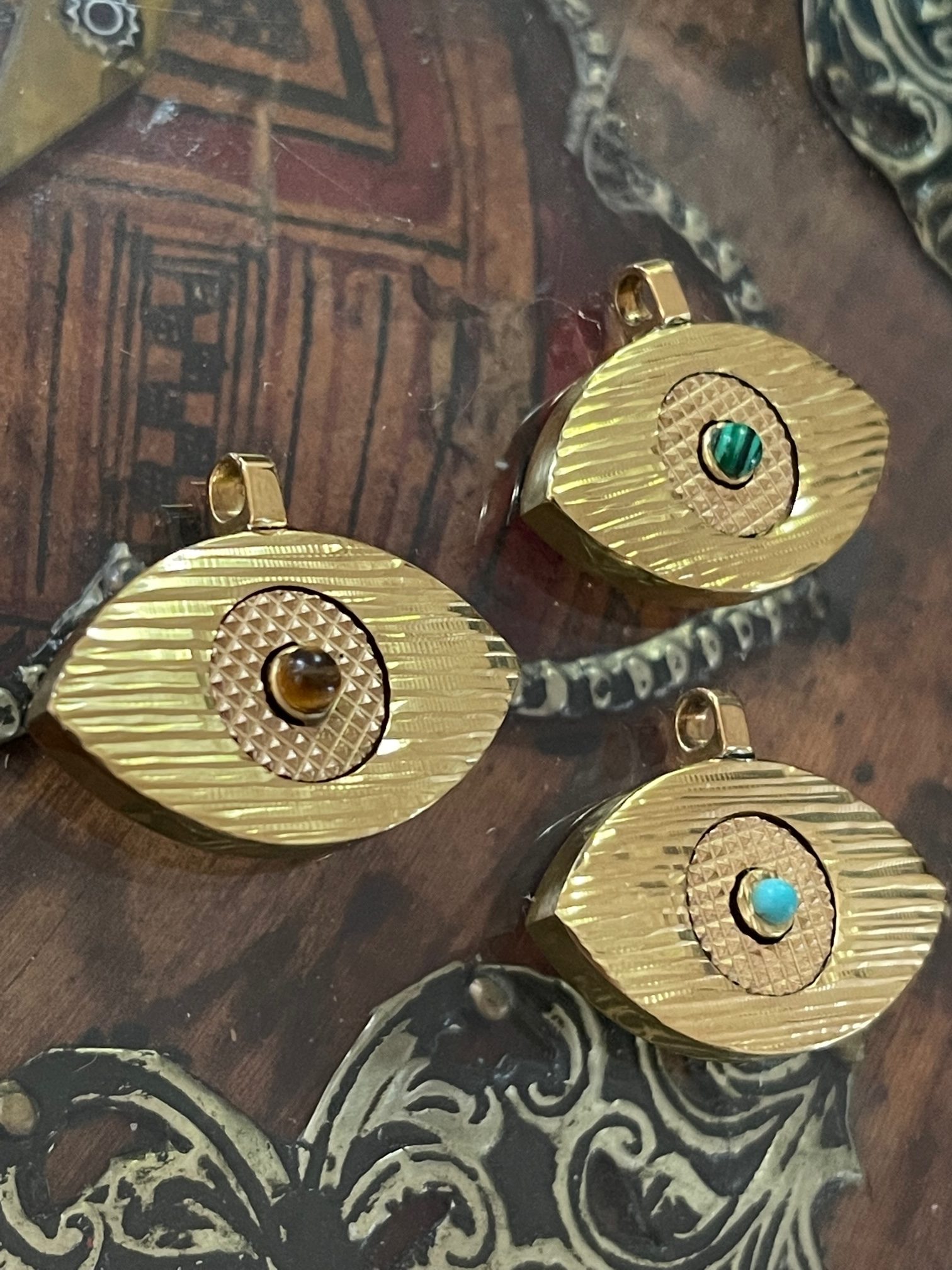Pendentif Eye – Oeil gravé 3 motifs laiton et turquoise