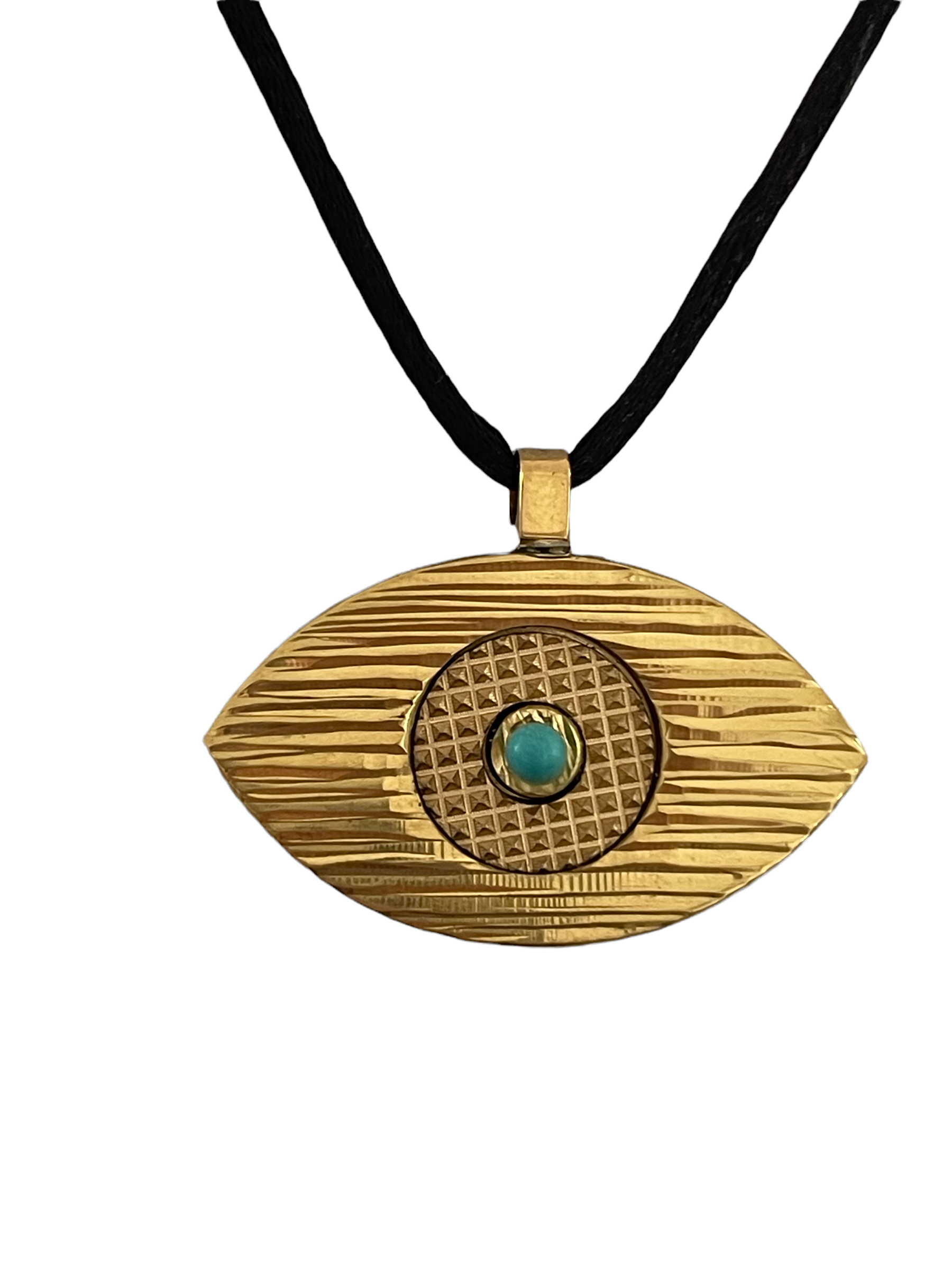Le Pendentif Eye de la Collection Mez est un oeil en laiton massif  en trois parties gravées et assemblées à la main, livré avec un lien en satin noir et un petit fermoir ajustable en laiton.