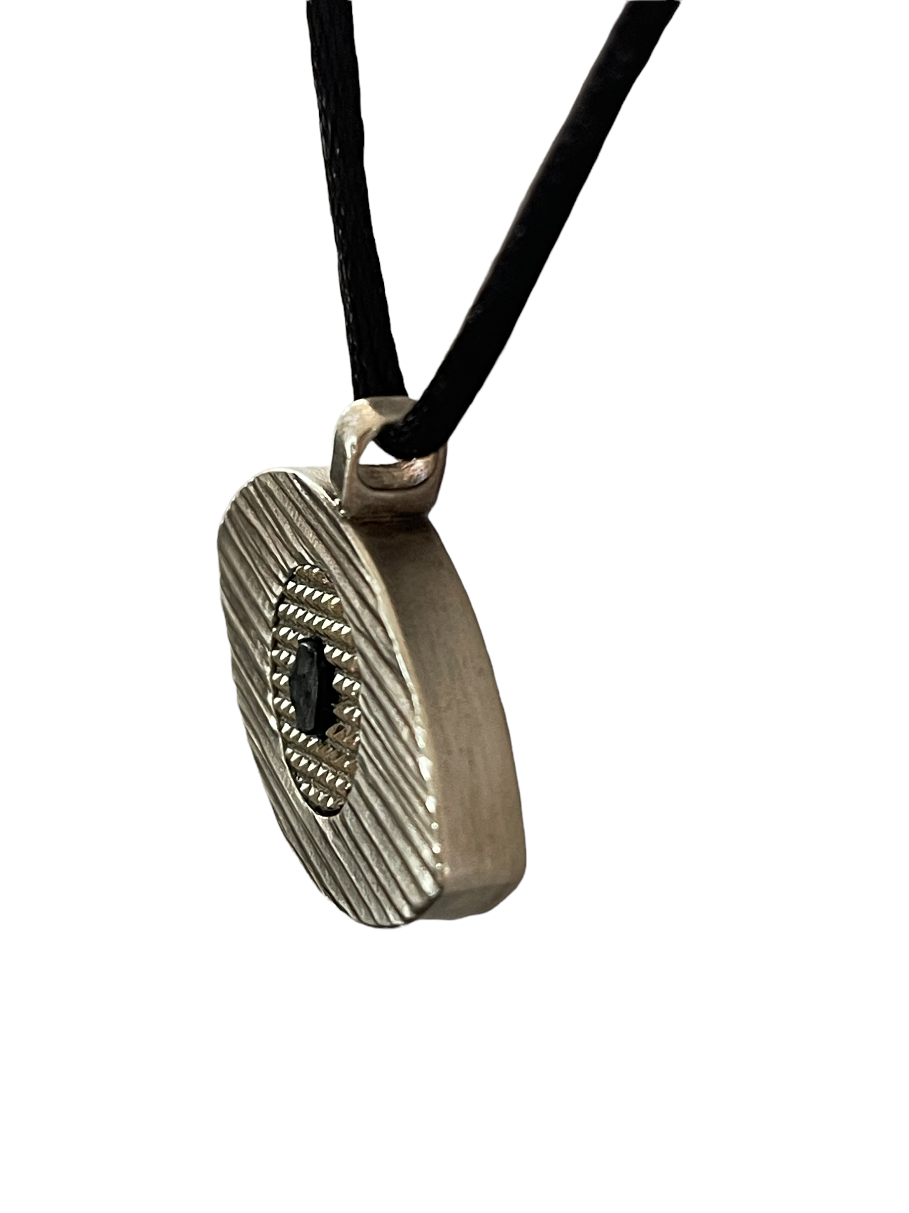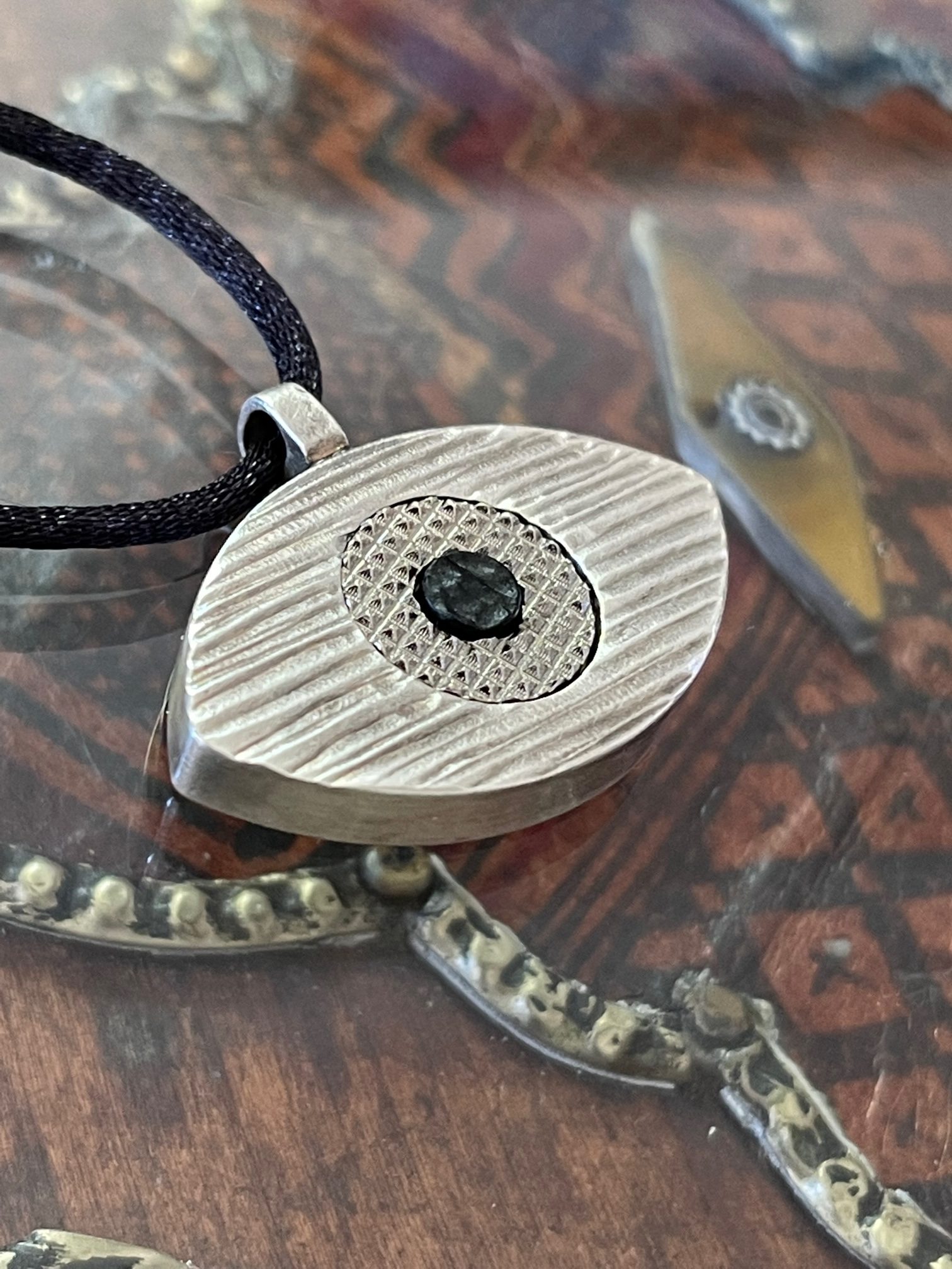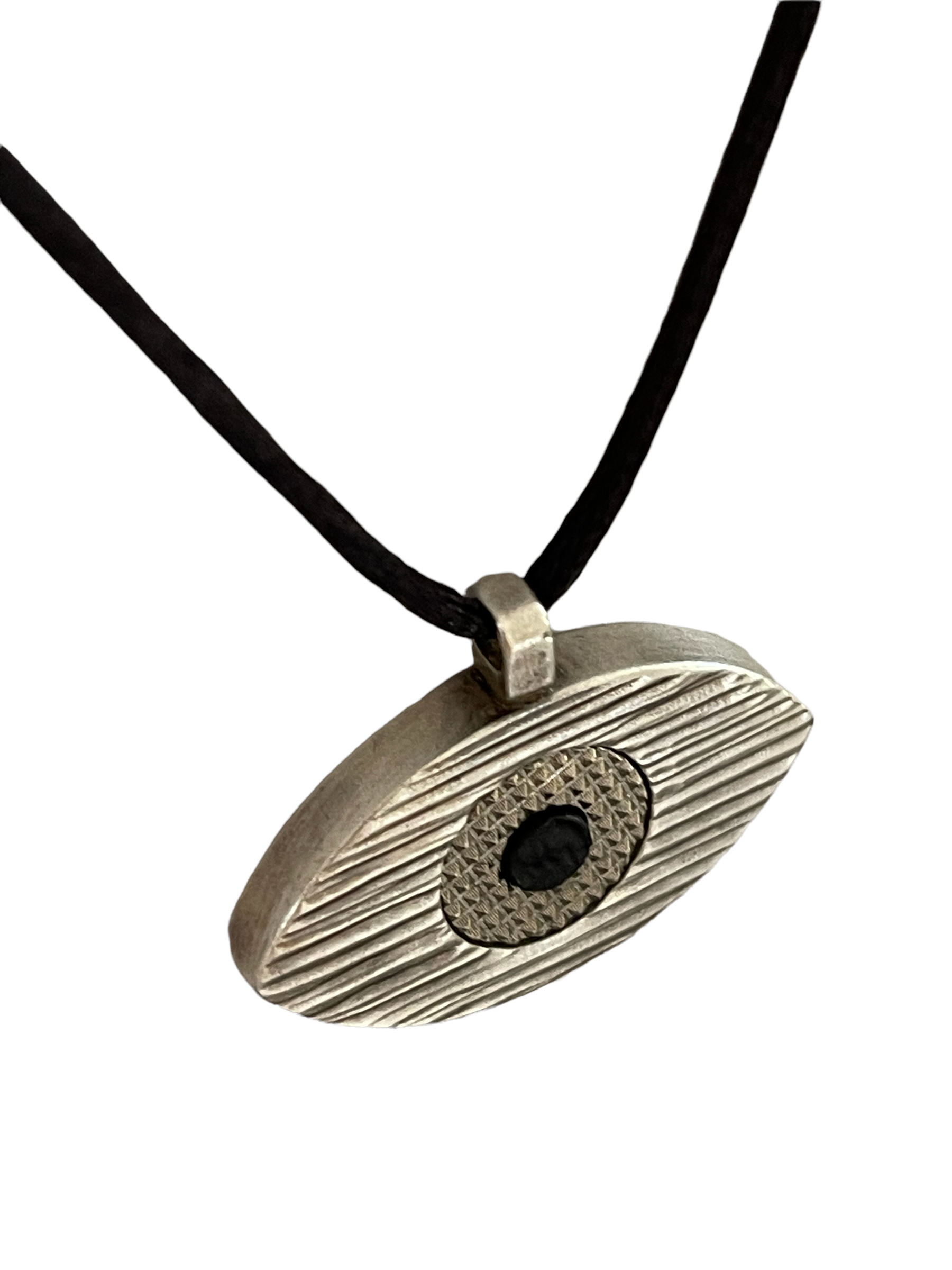 Le Pendentif Eye de la Collection Mez est un oeil en laiton massif  en trois parties gravées et assemblées à la main, livré avec un lien en satin noir et un petit fermoir ajustable en laiton.