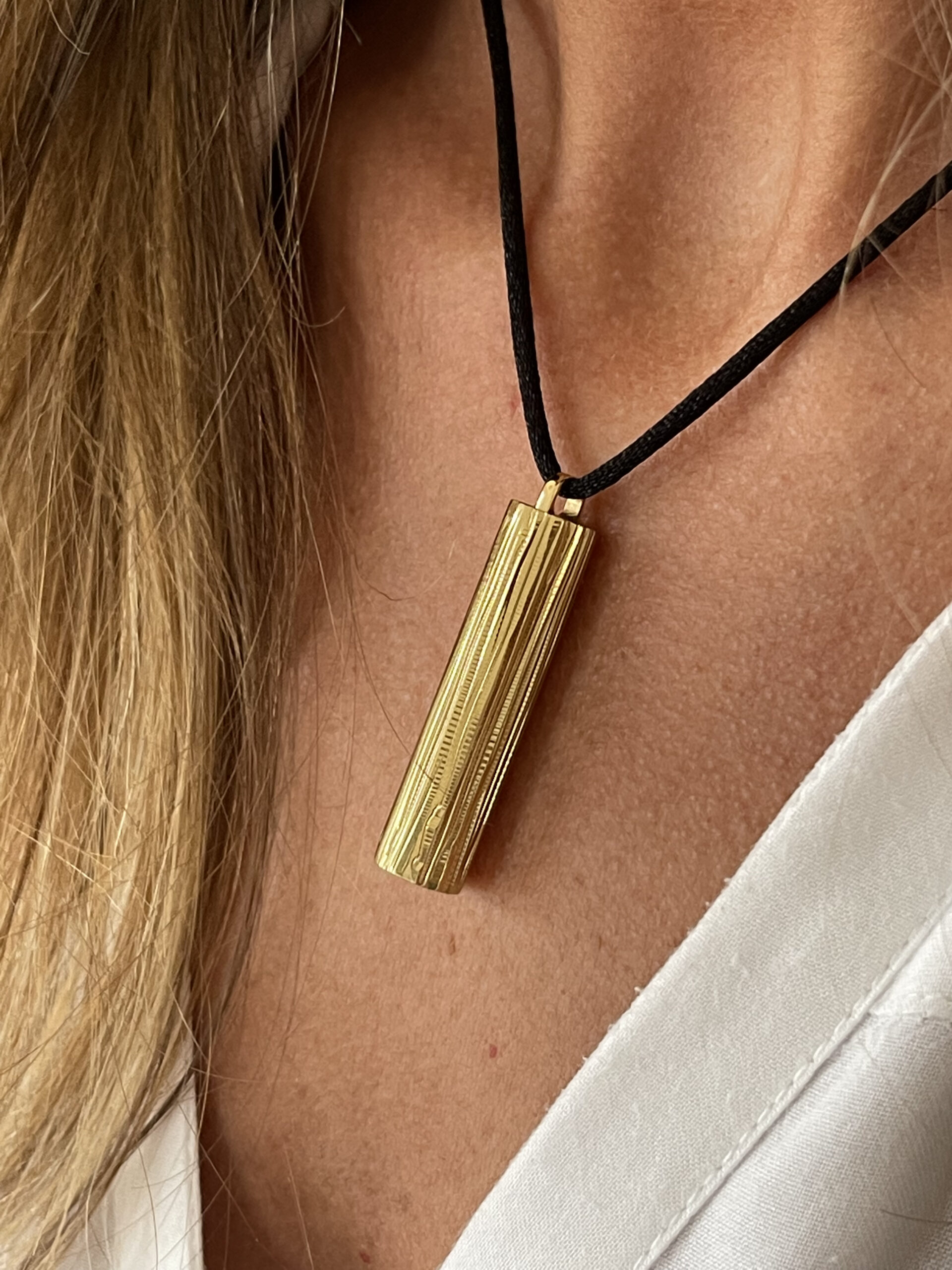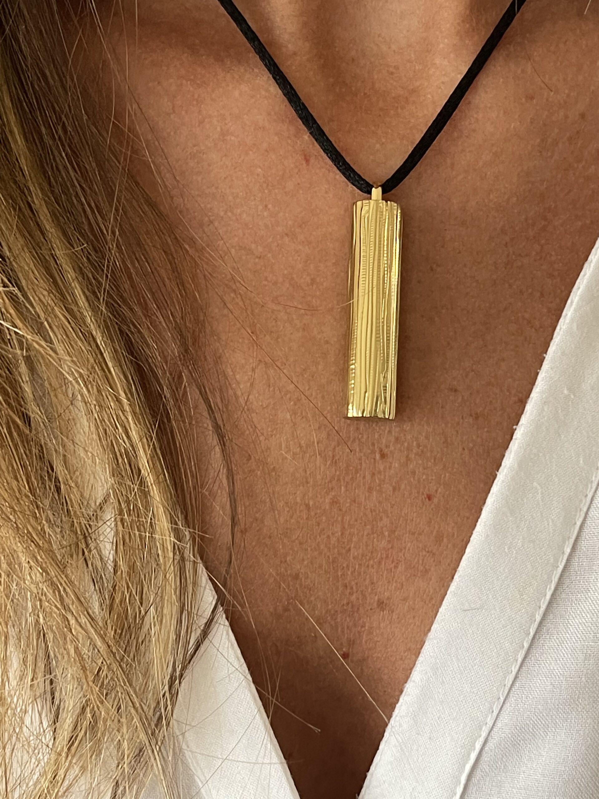 Pendentif Le Mez secret en laiton massif doré « Lines », gravé d’environ 29 gr livré avec un lien en satin noir et petit fermoir ajustable en laiton.