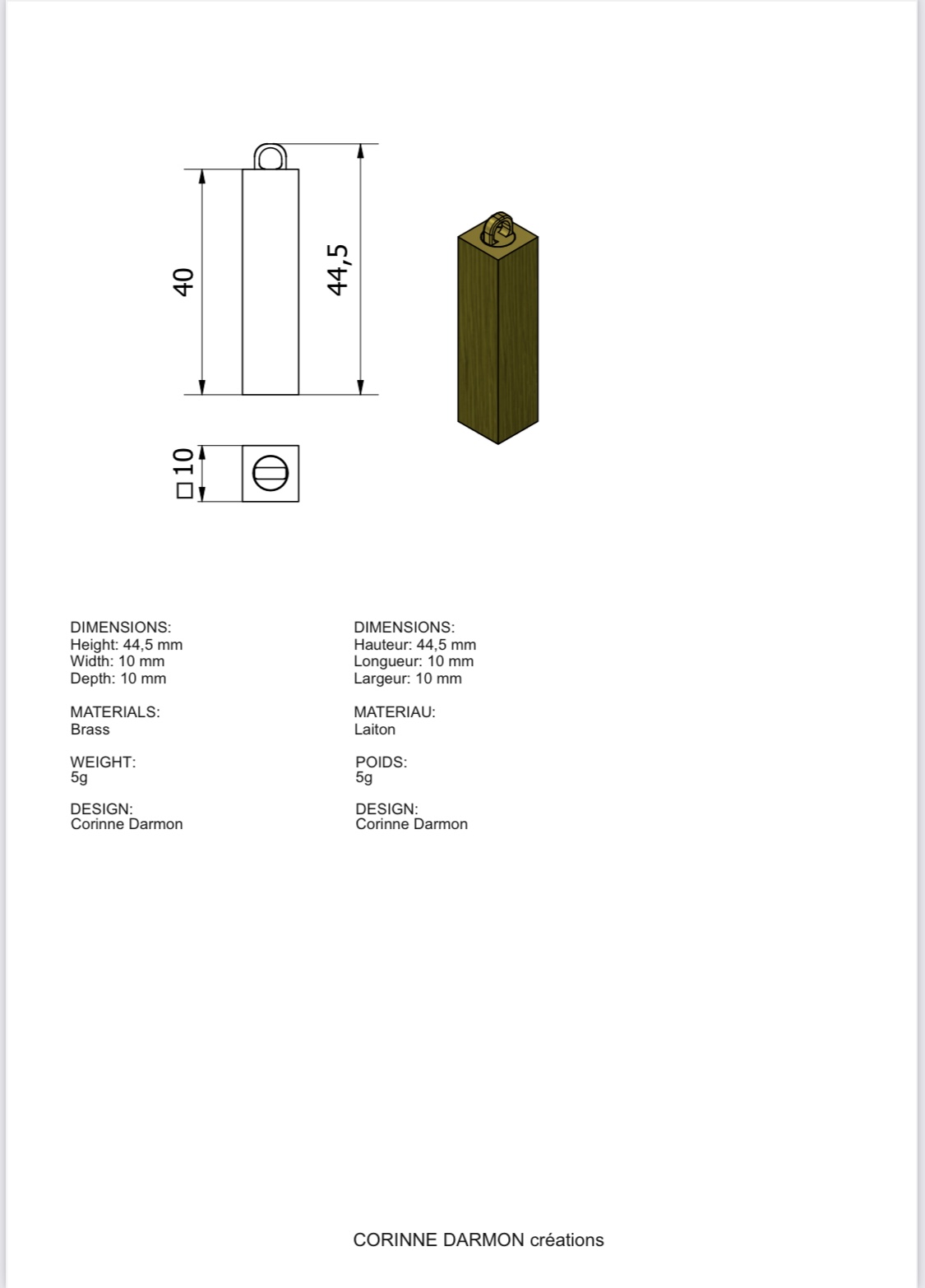 Pendentif Mez Secret Carré modèle Art-Déco en laiton gravé