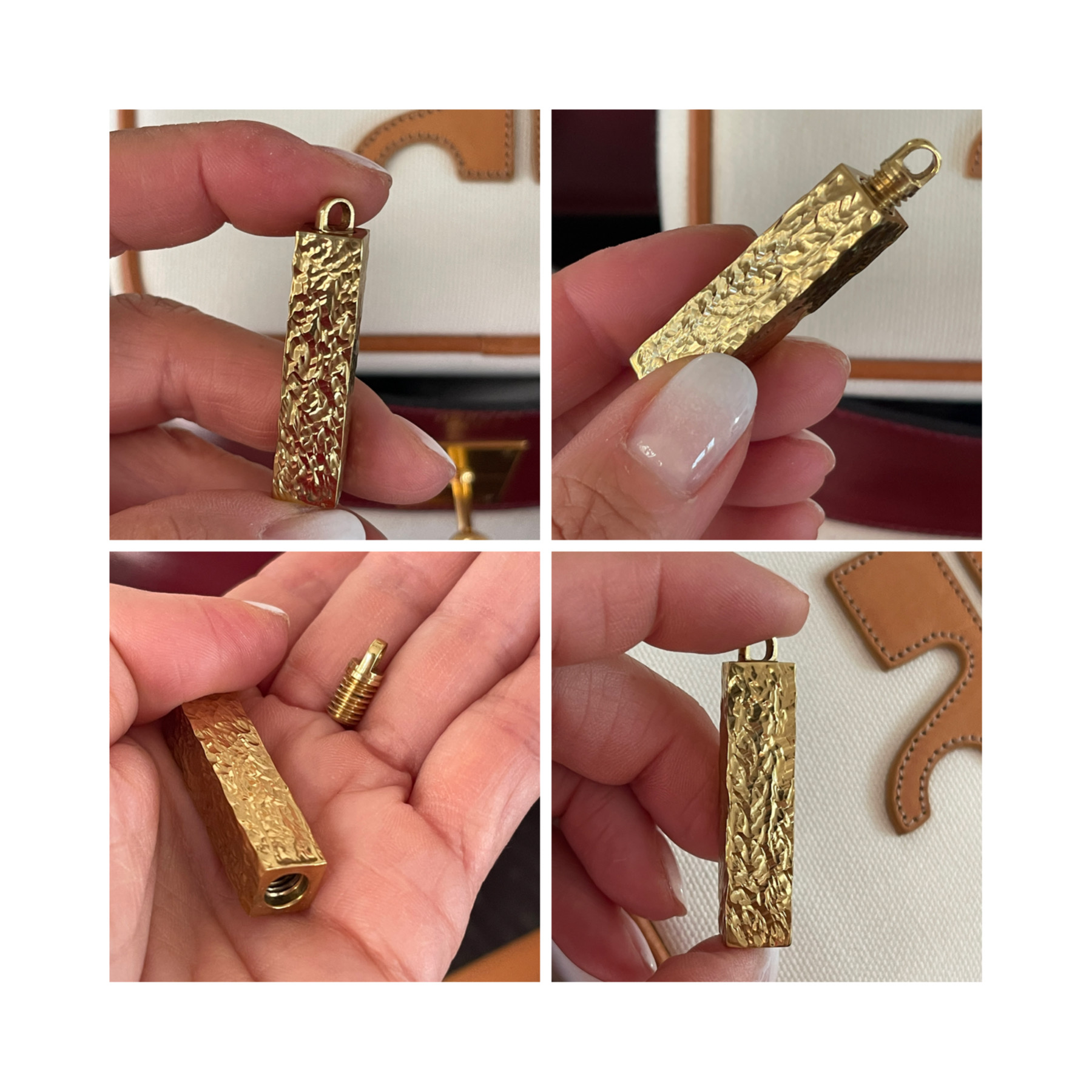 Le fermoir se dévisse et permet de cacher un petit mot, une pierre, un trésor. Motif guilloché sur le corps du pendentif.