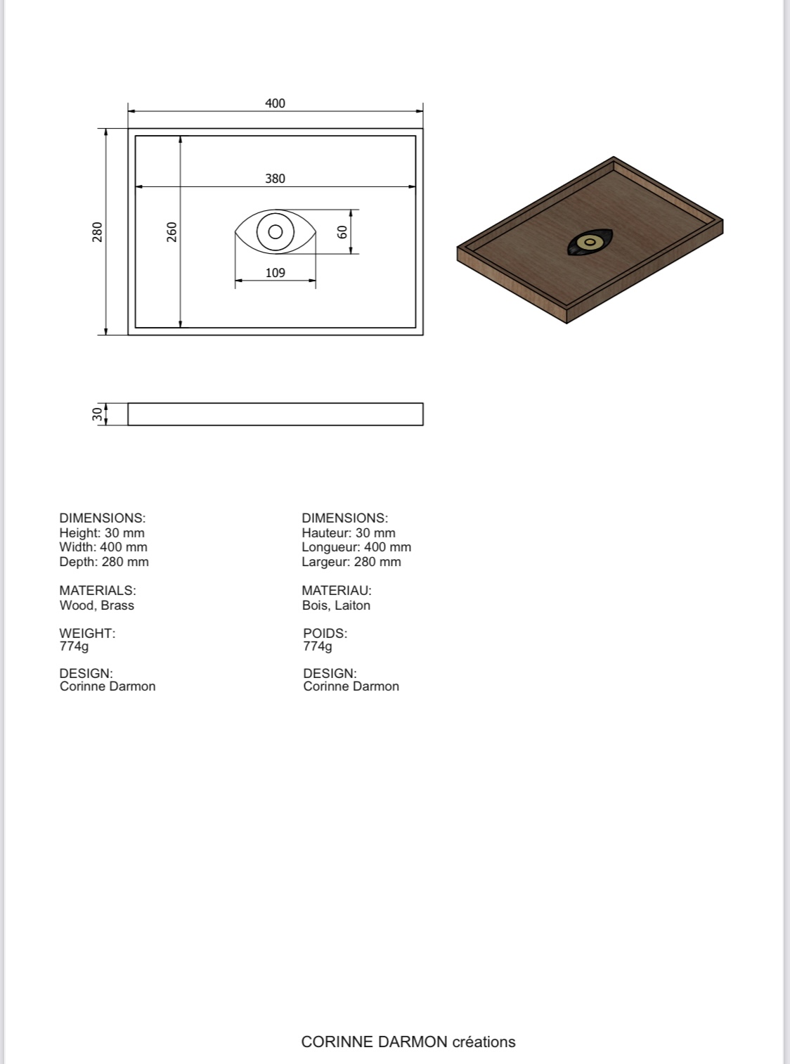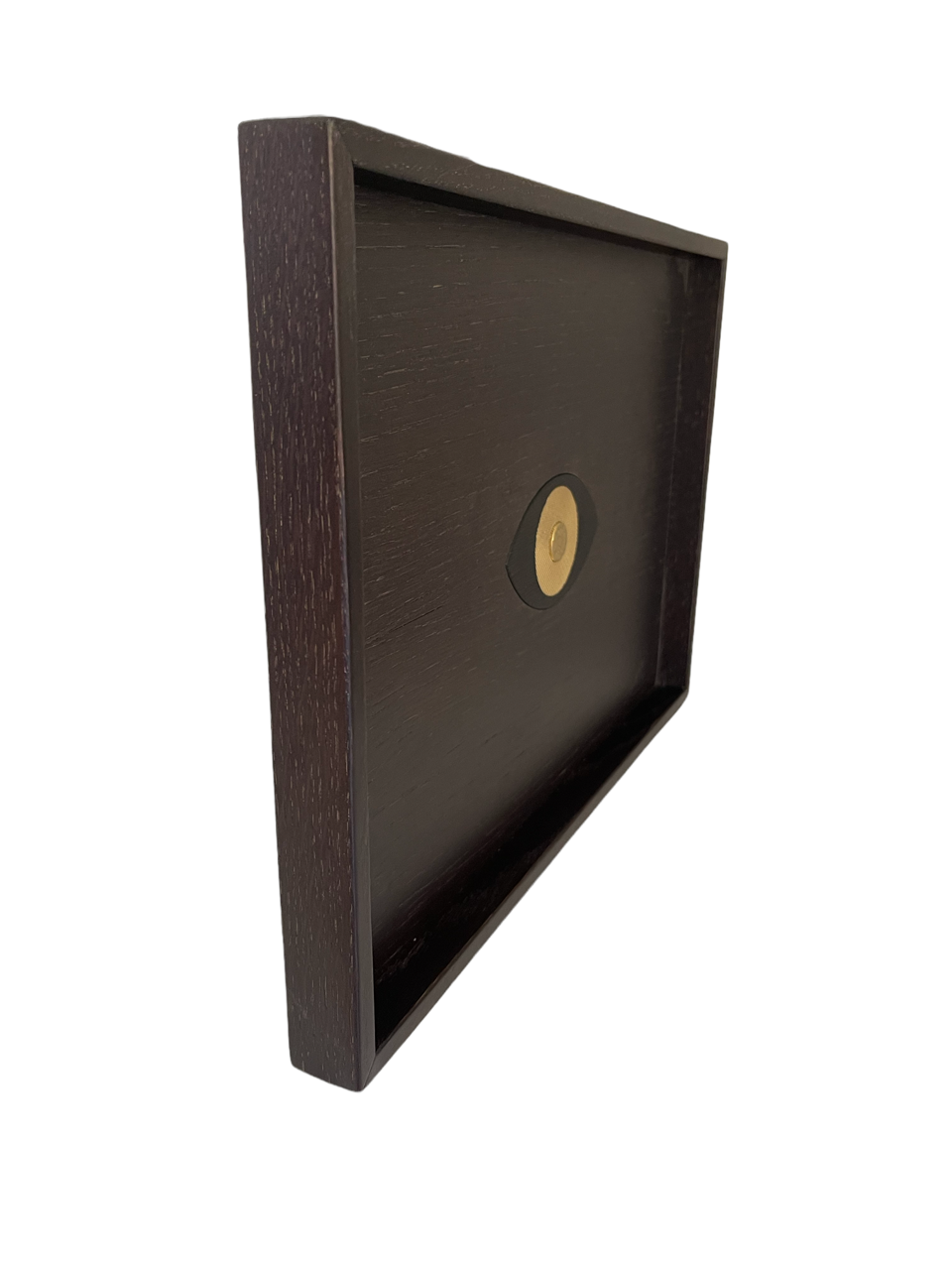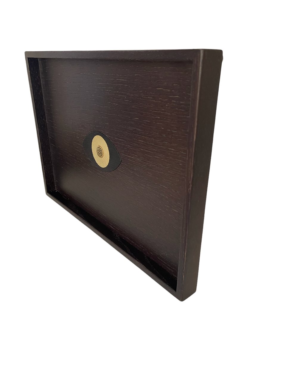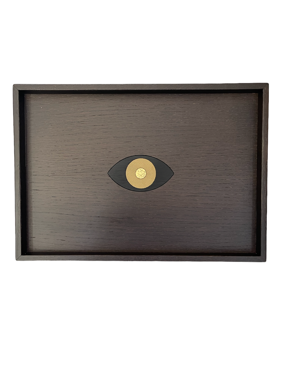 Plateau en Chêne massif teinté wengé avec un oeil incrusté en son centre en laiton massif en trois parties gravées.