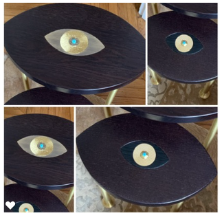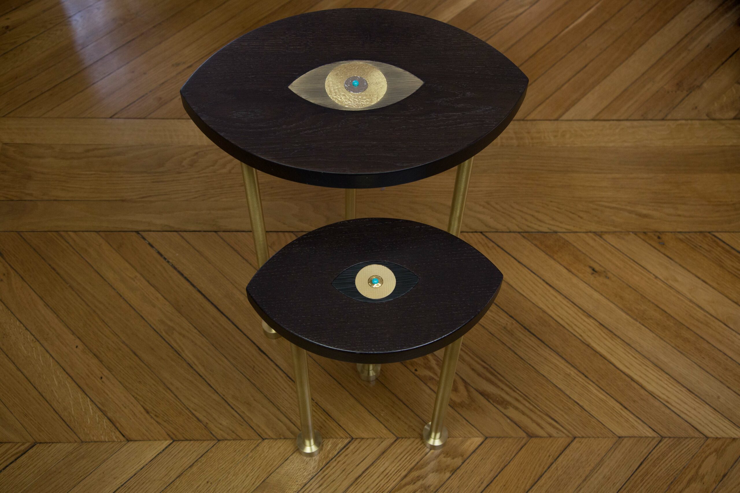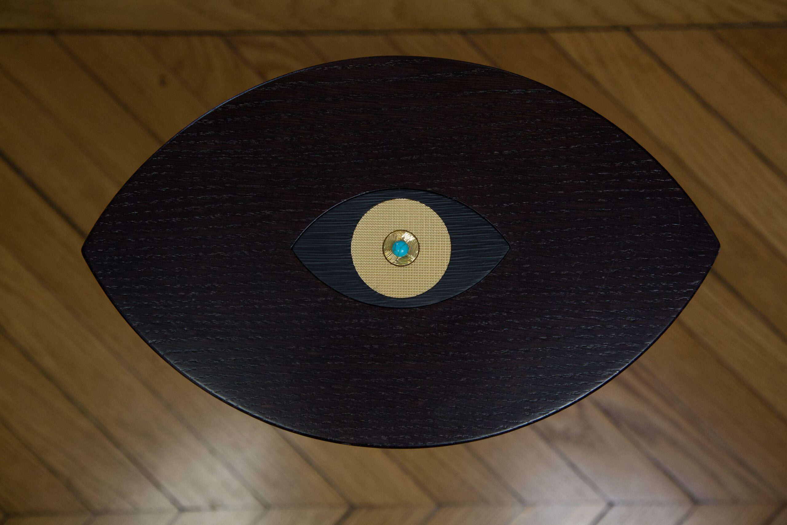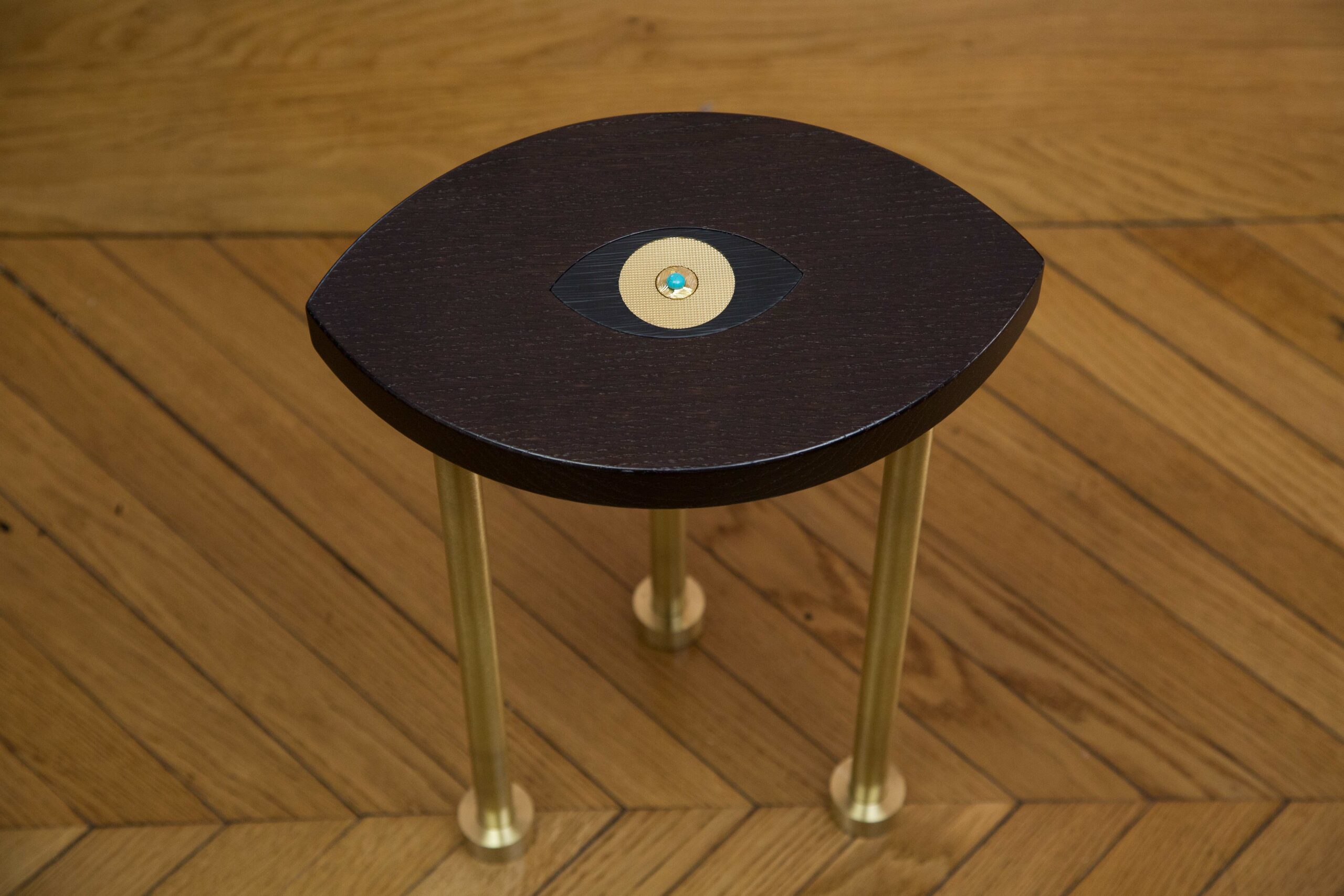 Table petit modèle en forme d’œil en chêne teinté Wengé avec œil incrusté en trois parties guillochées et pieds en laiton massif or mat.